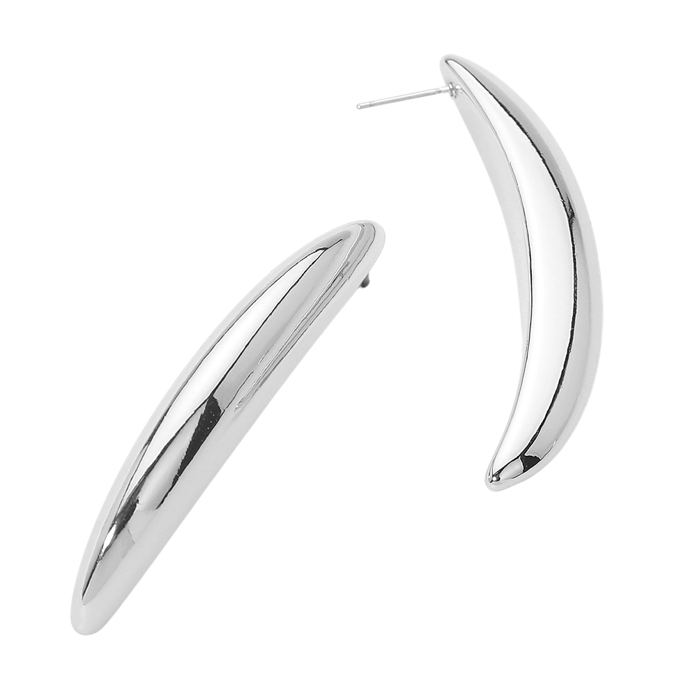 Details • Size : 0.3" X 2.25" • Post Back • Modern curved stud earrings featuring a sleek, sculptural silhouette that adds effortless edge to any look. Designed for everyday wear or elevated styling, these statement studs pair easily with casual outfits, office looks, and evening ensembles while offering a clean, contemporary jewelry aesthetic. • Sterling Silver Dipped • Hypoallergenic • Lead and Nickel Compliant