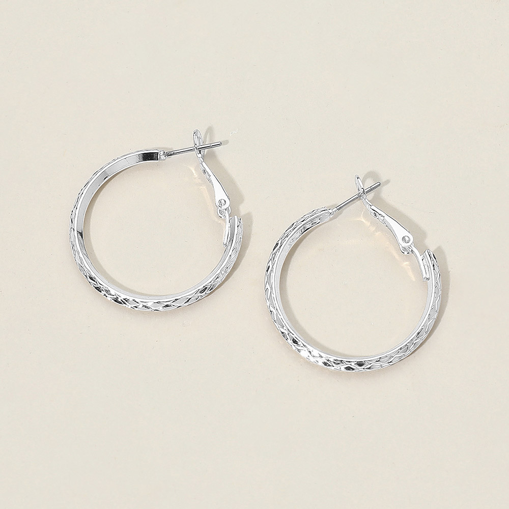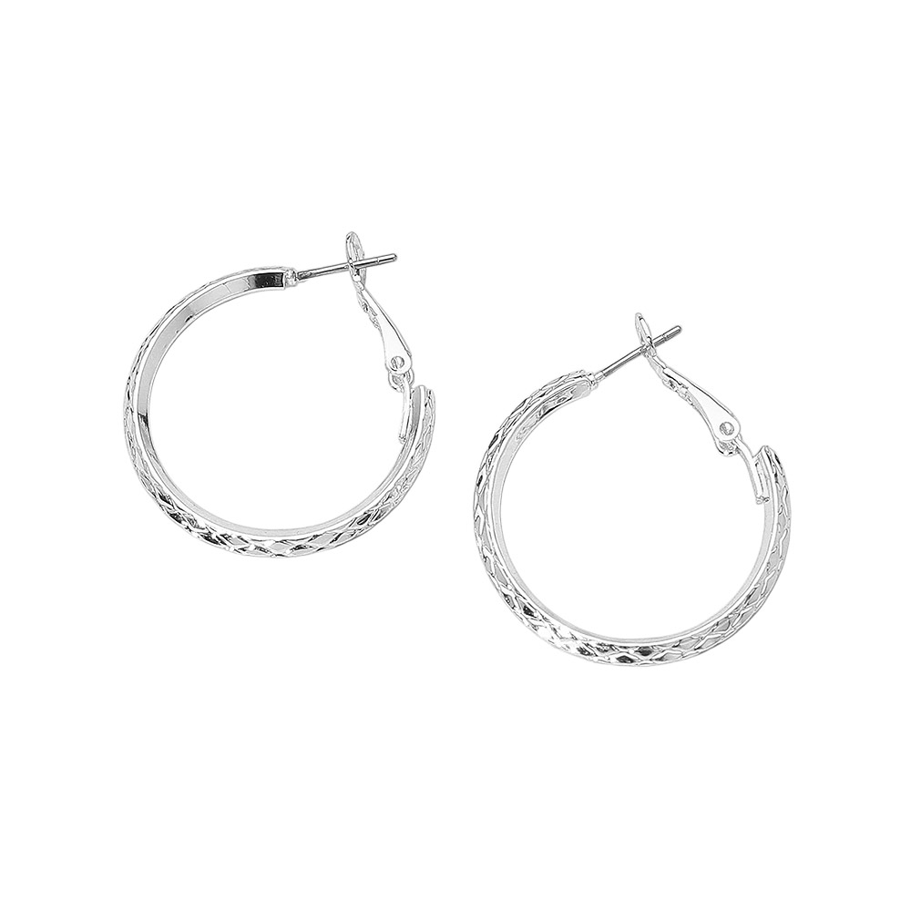 Details • Size : 1.2" X 1.2" • Omega Back • Chic small hoop earrings with a textured, diamond-cut look that adds stylish shine. Lightweight and comfortable with secure latch backs, perfect for daily wear or elevating casual and dressy outfits. • Sterling Silver Dipped • Lead and Nickel Compliant