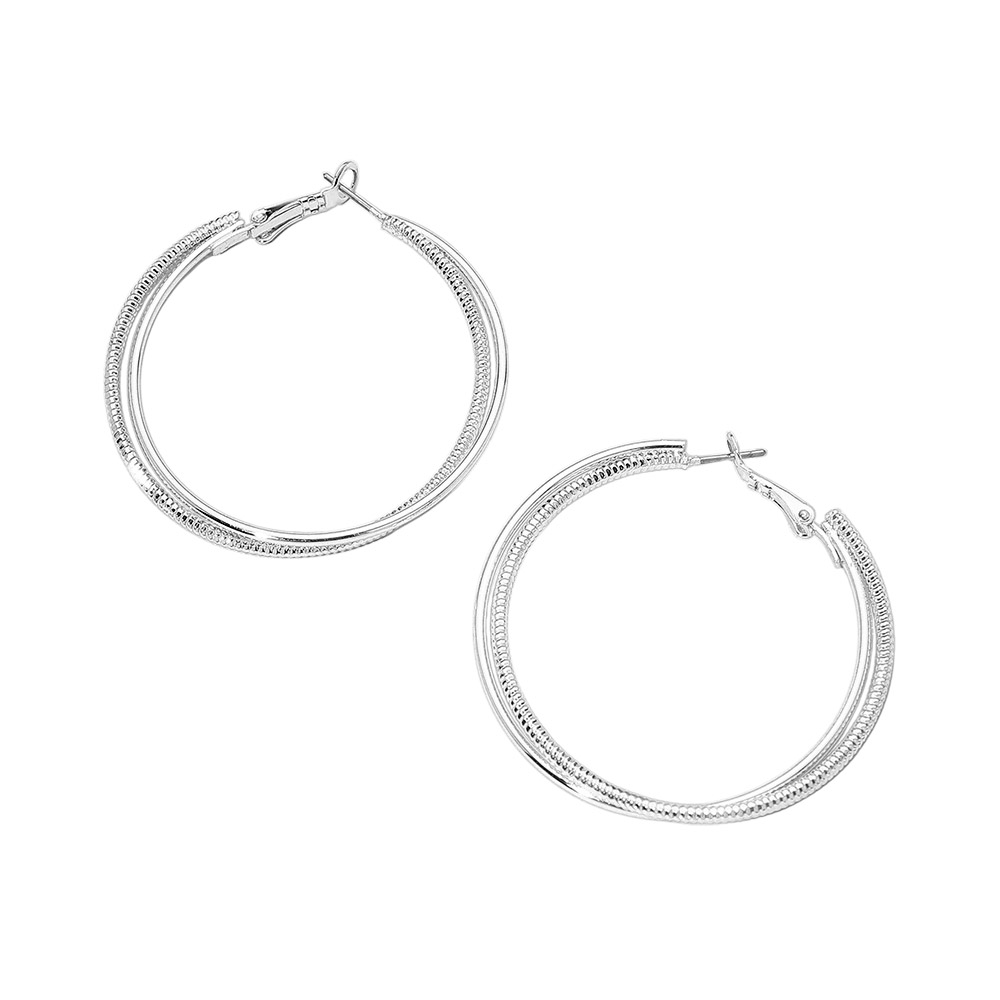 Details • Size : 2" X 2" • Omega Back • Classic medium textured hoop earrings featuring a detailed beaded-edge design and smooth rounded finish. Lightweight and comfortable with secure latch-back closures, perfect for elevating everyday outfits or adding a polished touch to special occasions. • Sterling Silver Dipped • Lead and Nickel Compliant