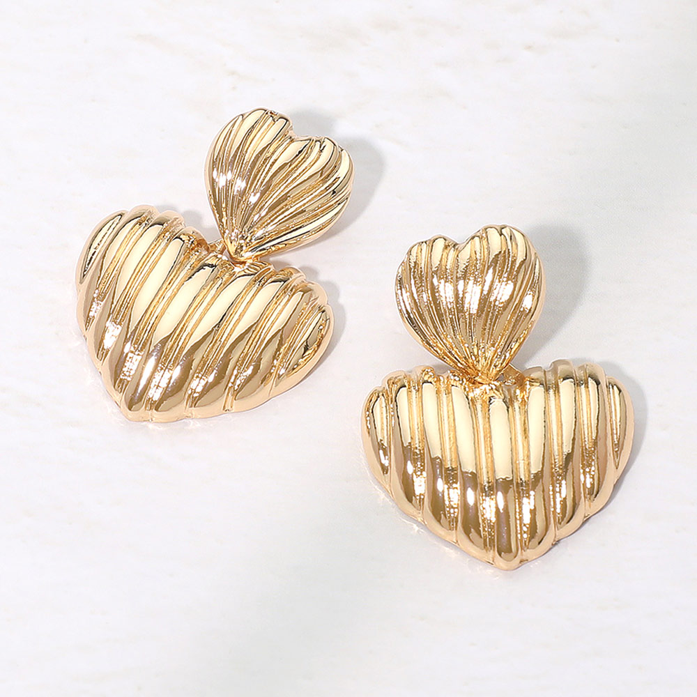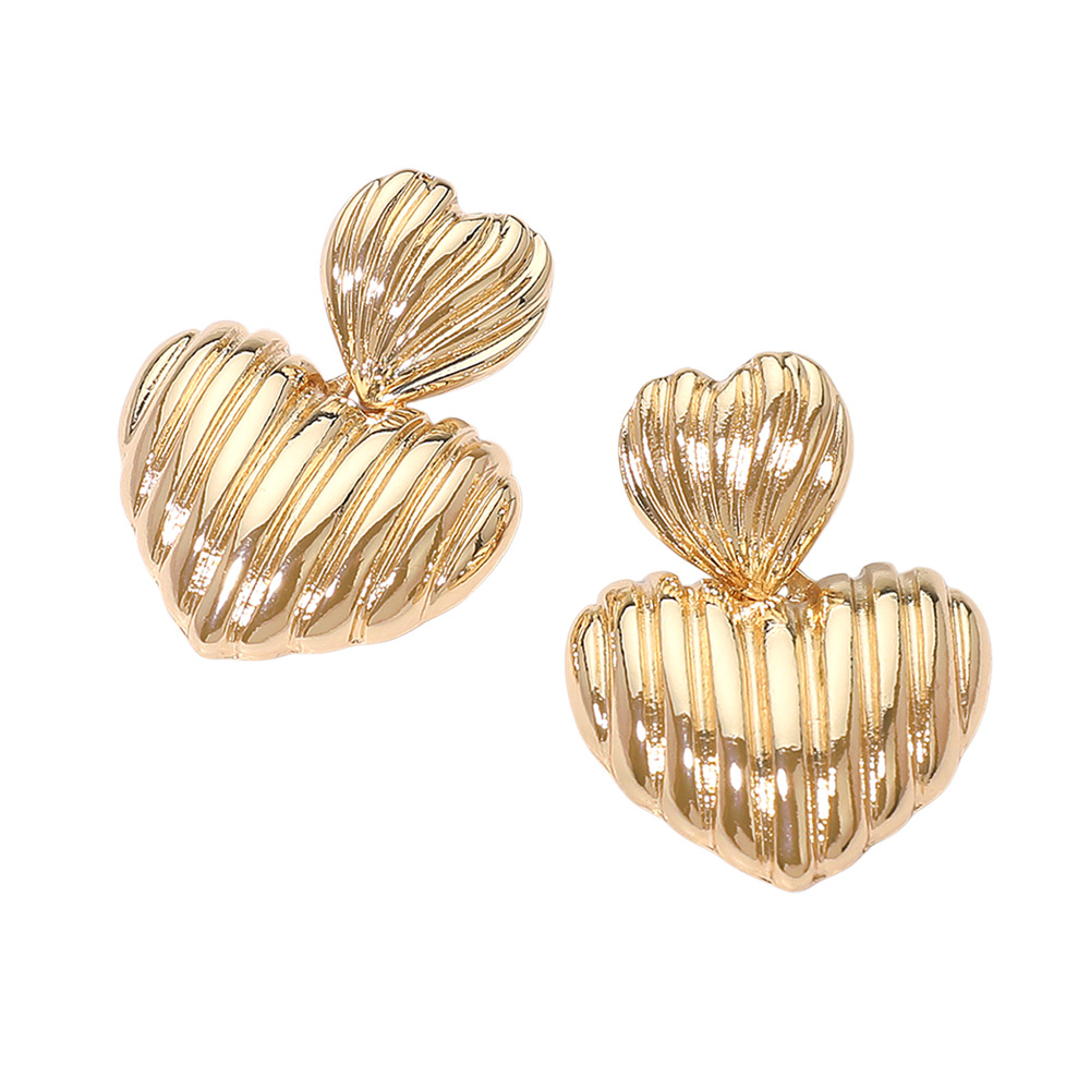 Details • Size : 1.1" X 1.6" • Post Back • Textured double heart drop earrings feature a layered heart silhouette with dimensional detailing for standout shine and bold style. Designed to elevate everyday outfits or special looks, they offer eye-catching movement and a romantic statement that pairs easily with any wardrobe. • Lead and Nickel Compliant
