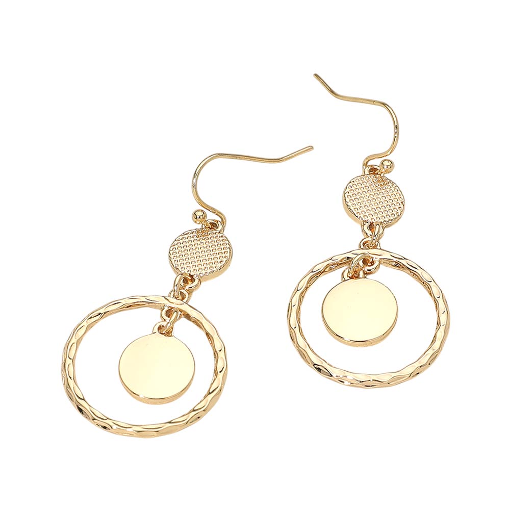 Details • Size : 0.8" X 1.75" • Fish Hook Back • Elevate everyday style with these textured hoop disc drop earrings. Featuring a circular open hoop paired with a smooth hanging disc and a subtle textured top accent, this design adds depth and gentle movement. Lightweight and comfortable, they transition easily from casual wear to work and evening looks. A versatile accessory that complements modern, minimalist, and seasonal collections while offering timeless appeal and effortless styling. • Lead and Nickel Compliant