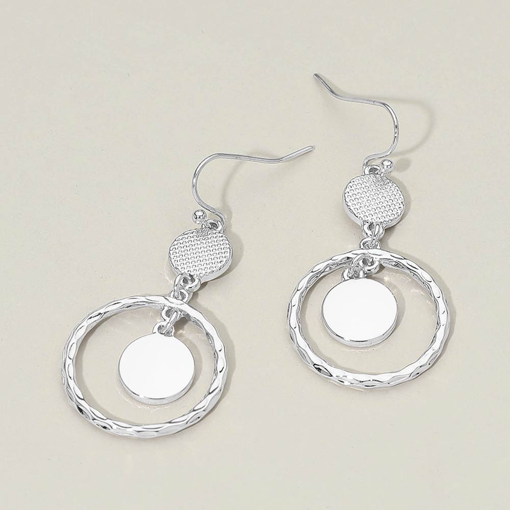 Details • Size : 0.8" X 1.75" • Fish Hook Back • Elevate everyday style with these textured hoop disc drop earrings. Featuring a circular open hoop paired with a smooth hanging disc and a subtle textured top accent, this design adds depth and gentle movement. Lightweight and comfortable, they transition easily from casual wear to work and evening looks. A versatile accessory that complements modern, minimalist, and seasonal collections while offering timeless appeal and effortless styling. • Lead and Nickel Compliant