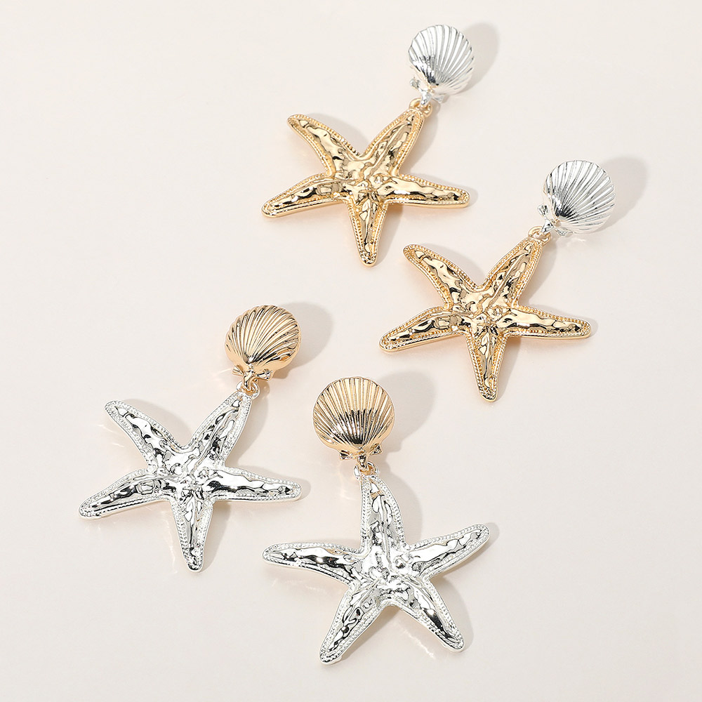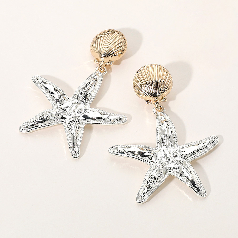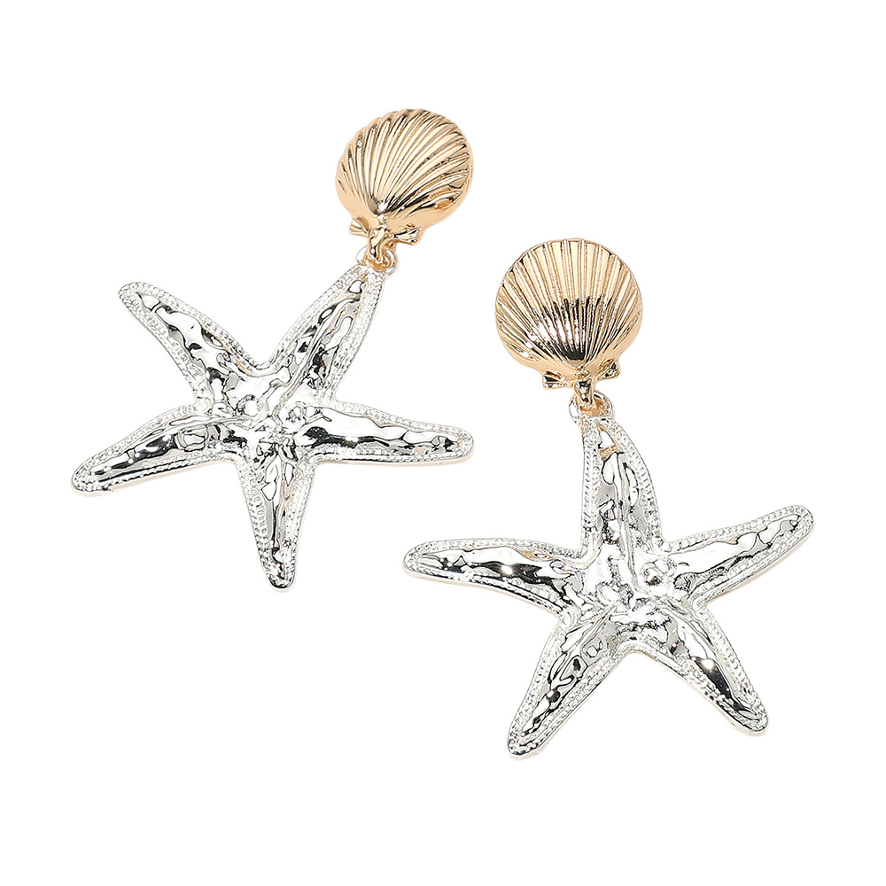 Two Tone Sea Shell Pointed Textured Metal Starfish Dangle Earrings