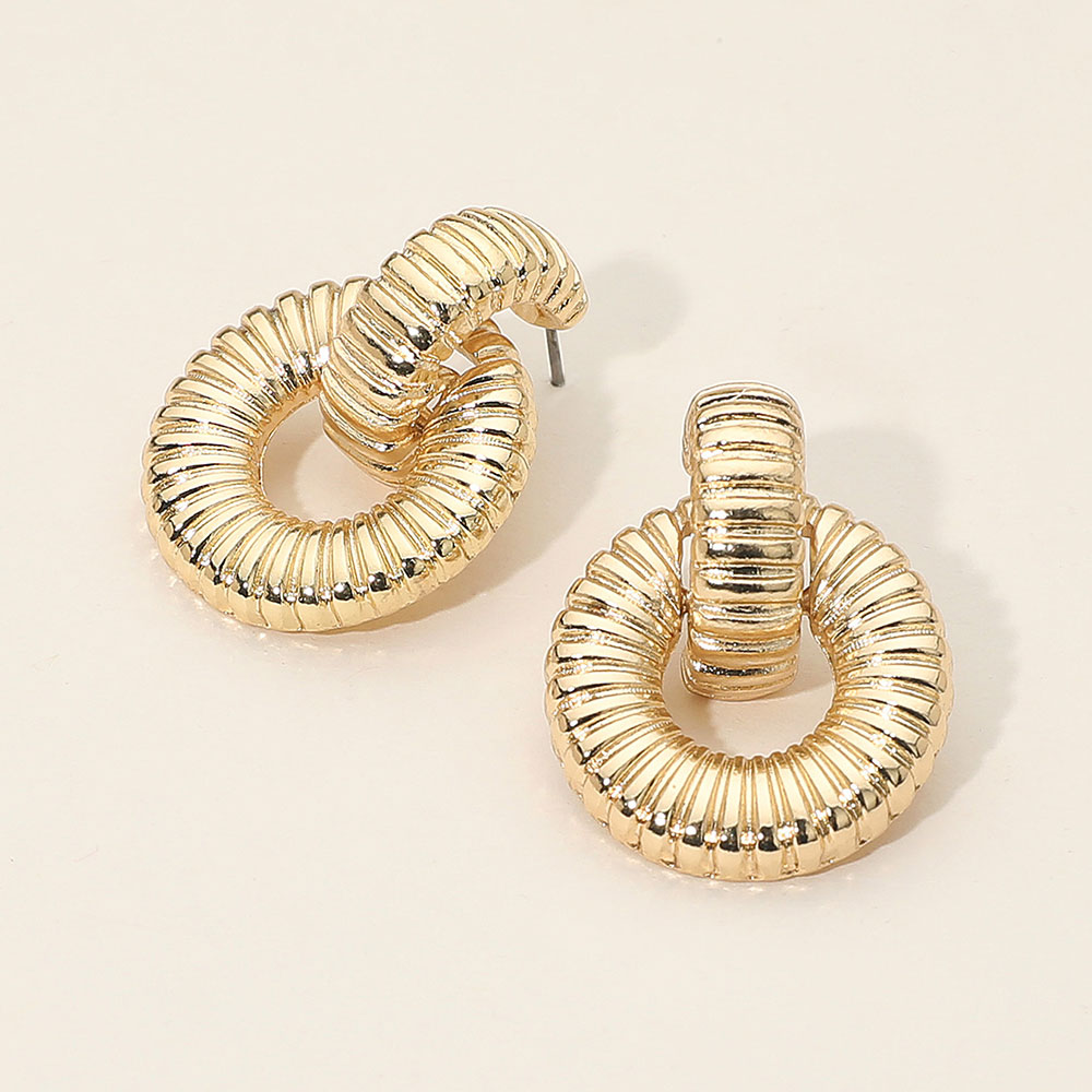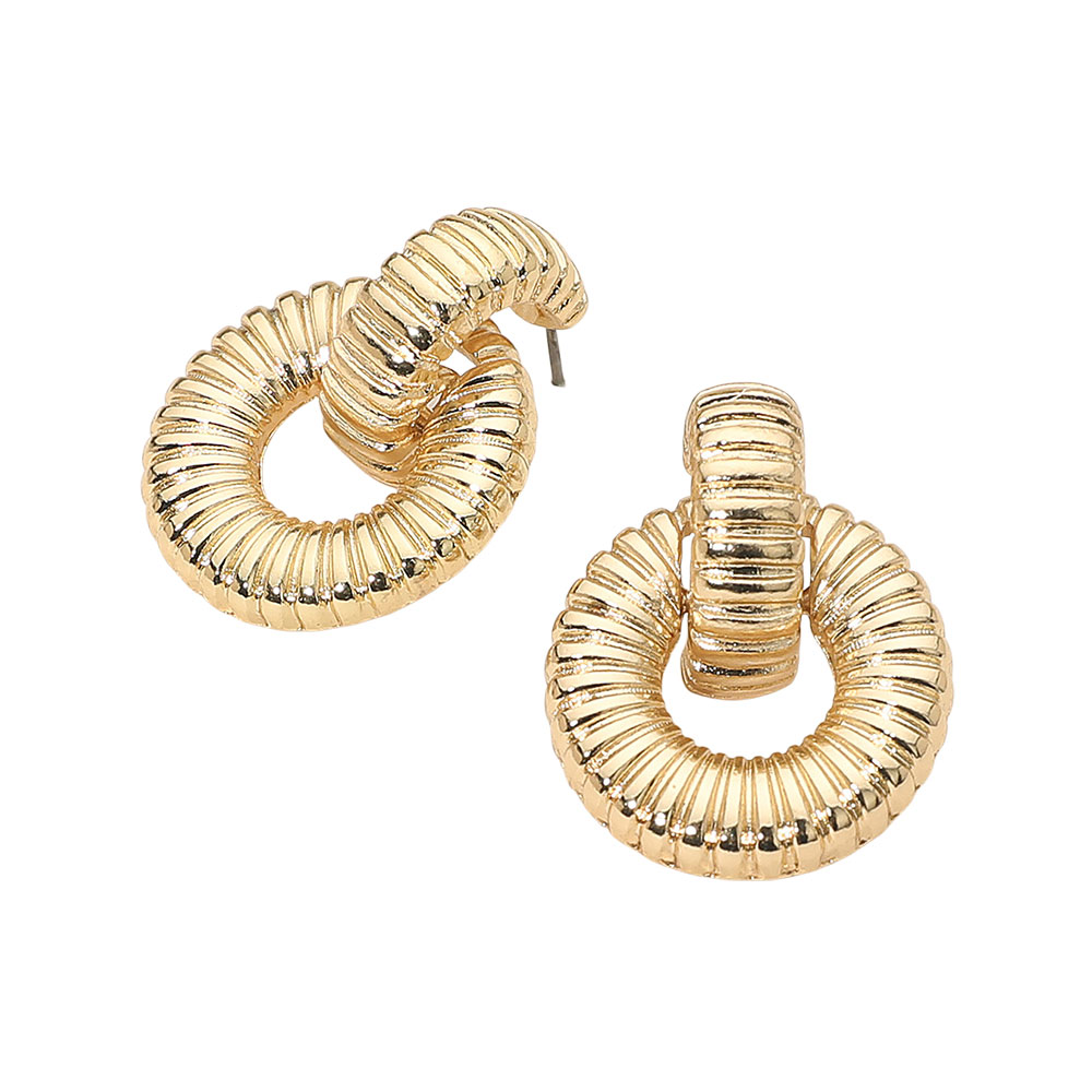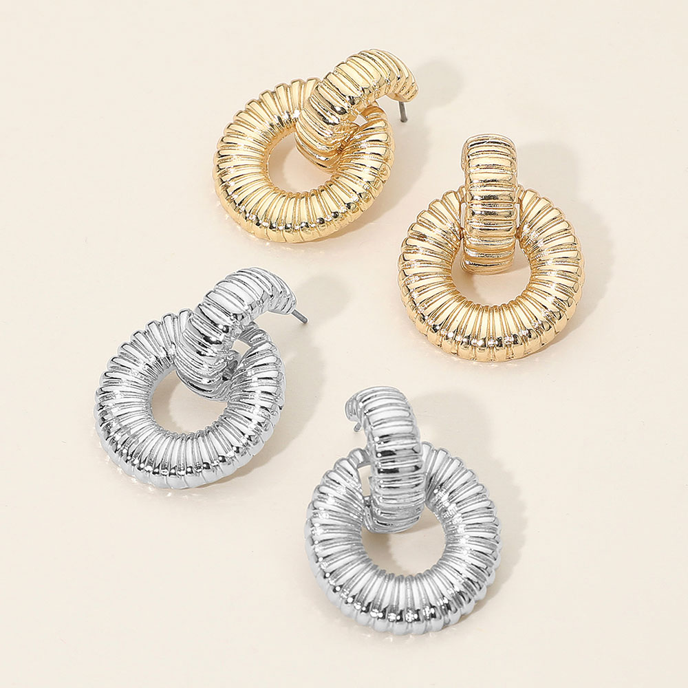 Details • Size : 1" X 1.25" • Post Back • Elevate your accessory game with these textured circle earrings. Their sculpted design and interlocking loops create a bold yet elegant statement, perfect for adding modern sophistication to both casual and dressy looks. • Lead and Nickel Compliant
