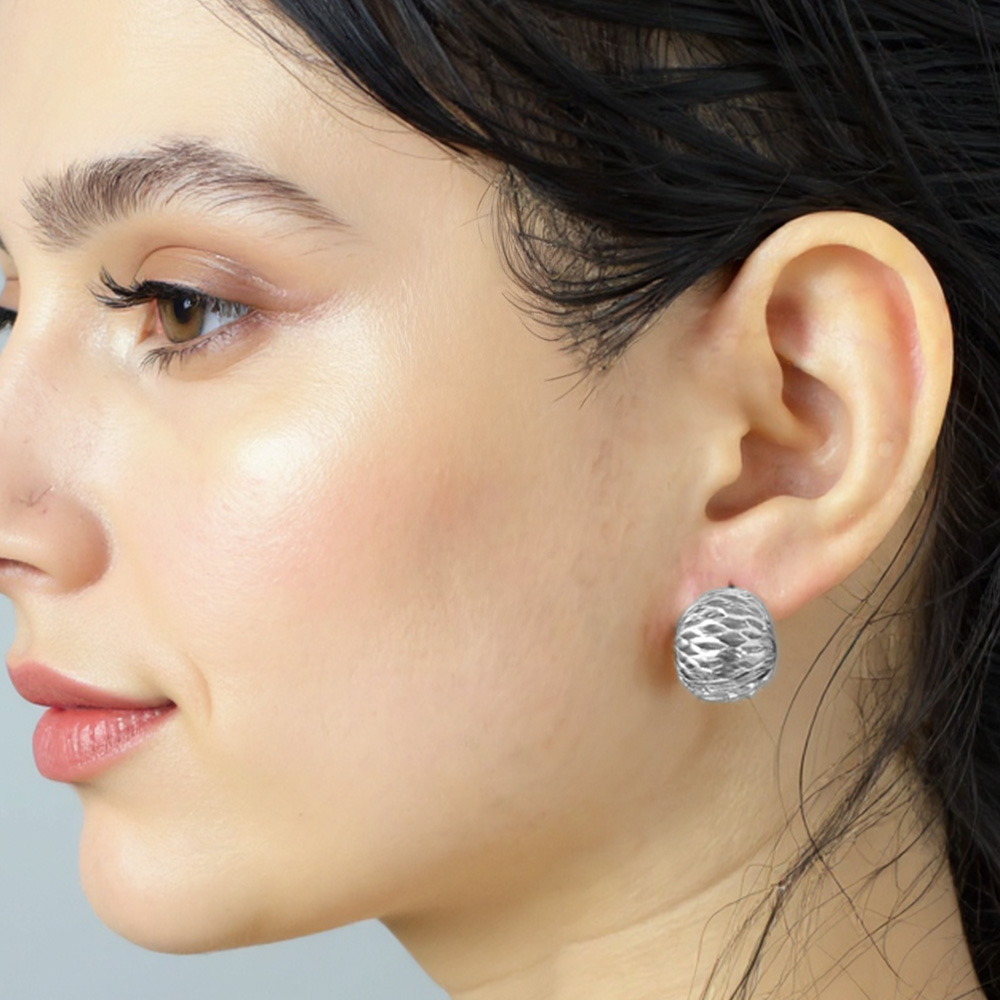 Details • Size : 0.75" X 0.75" • Post Back • Stylish cutout dome stud earrings featuring a textured open lattice design that blends bold structure with lightweight comfort. Perfect for adding a touch of modern elegance to casual or dressy looks, these earrings stand out as a versatile accessory in any jewelry collection. • Brass • Gold Dipped • Hypoallergenic • Lead and Nickel Compliant • Made In Korea