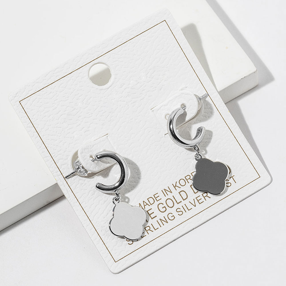White Gold Dipped Quatrefoil Charm Drop Dangle Mini Hoop Earrings