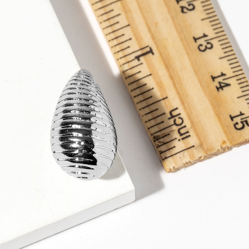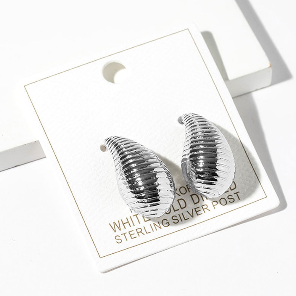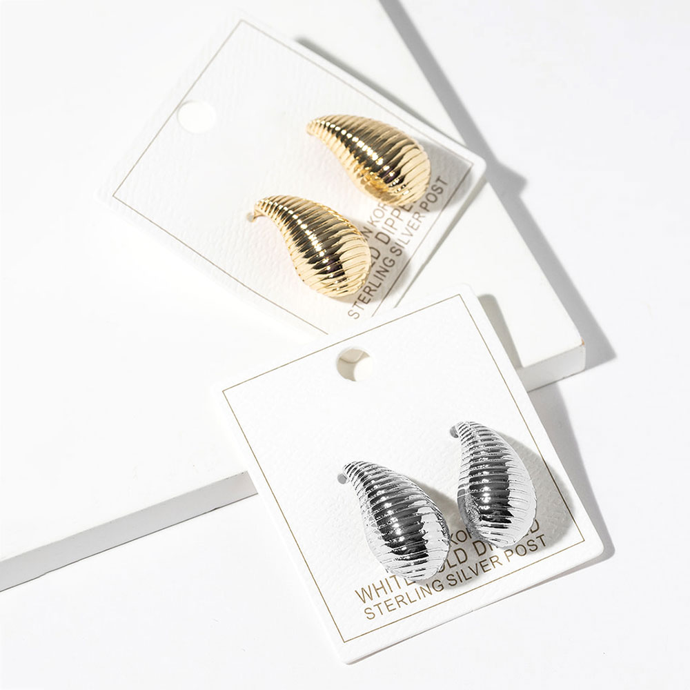 Details • Size : 0.6" X 1.2" • Modern teardrop stud earrings featuring a sculpted ribbed texture for a sleek, dimensional look. Designed to reflect light beautifully, these studs offer a refined statement that transitions effortlessly from everyday wear to evening styling, making them a versatile addition to any accessory collection. • Gold Dipped • Lead and Nickel Compliant • Made In Korea • Sterling Silver Post