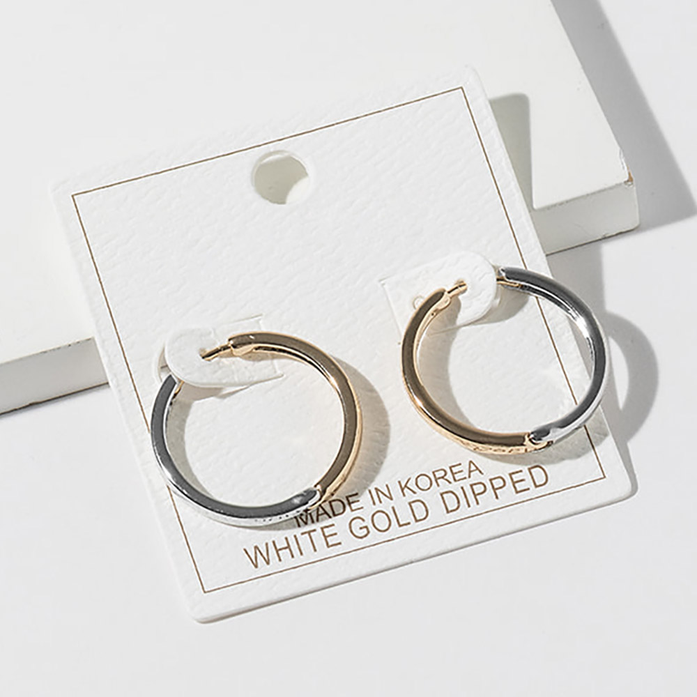Details • Size : 1" X 1" • Huggie Back • Timeless classic hoop earrings featuring a smooth rounded silhouette with a modern dual-tone design and secure post closure. Perfect for everyday wear, office looks, and effortless styling, these versatile hoops offer balanced contrast, clean lines, and polished elegance for a refined jewelry collection. • Gold Dipped • Lead and Nickel Compliant • Made In Korea