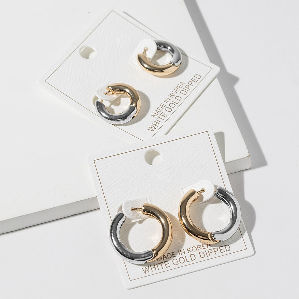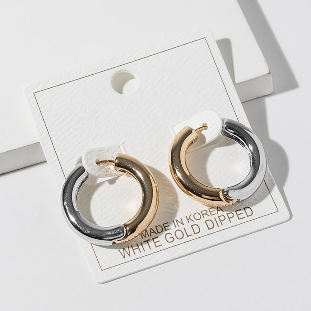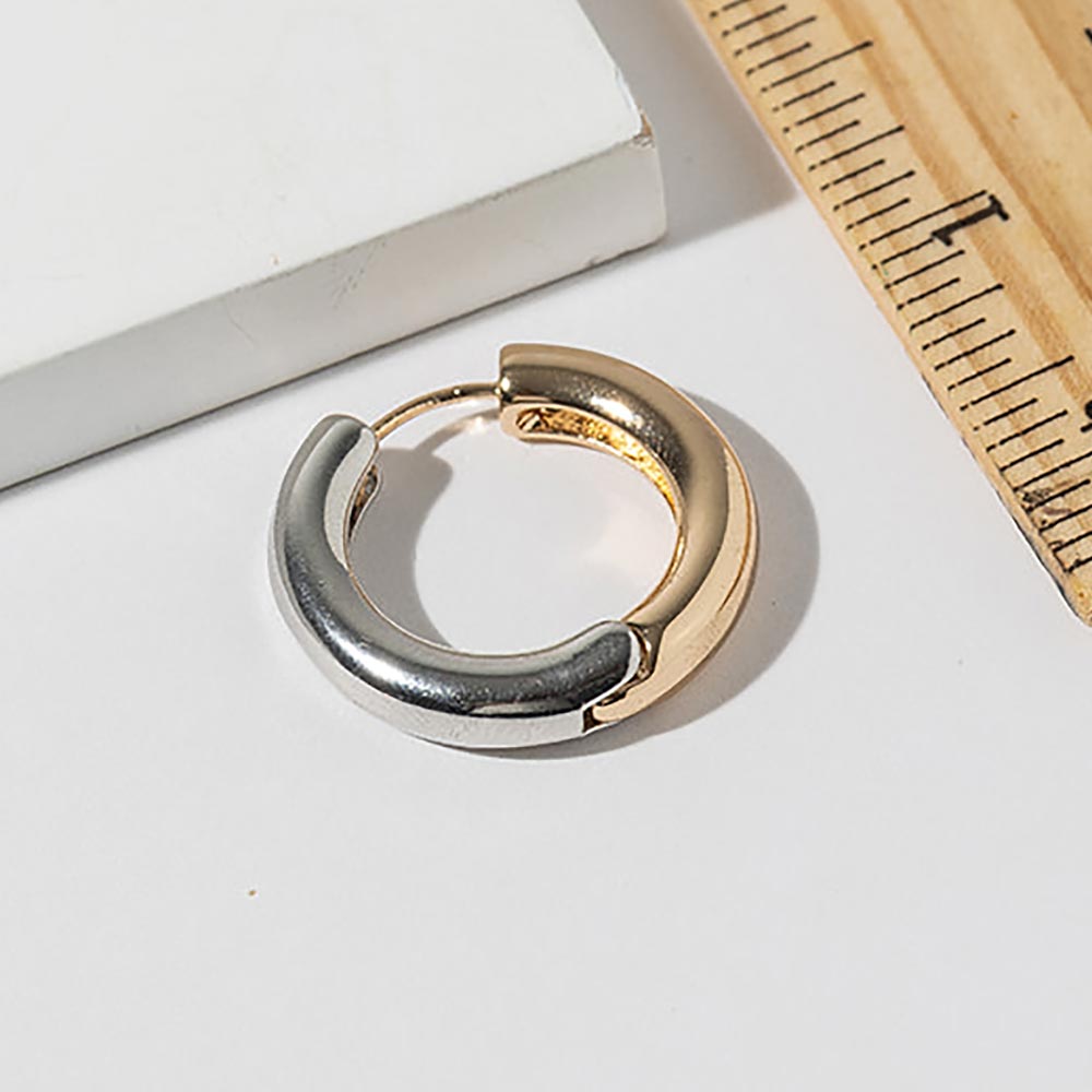 Details • Size : 1" X 1" • Huggie Back • Modern huggie hoop earrings featuring a sleek rounded silhouette with a clean two-finish design and secure hinged closure. Ideal for everyday wear, work outfits, and minimalist styling, these versatile hoops add polished sophistication, subtle contrast, and effortless style to any jewelry collection. • Gold Dipped • Lead and Nickel Compliant • Made In Korea