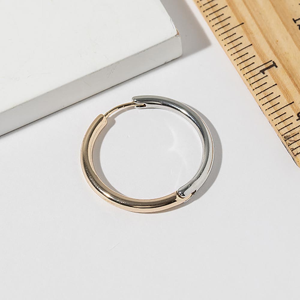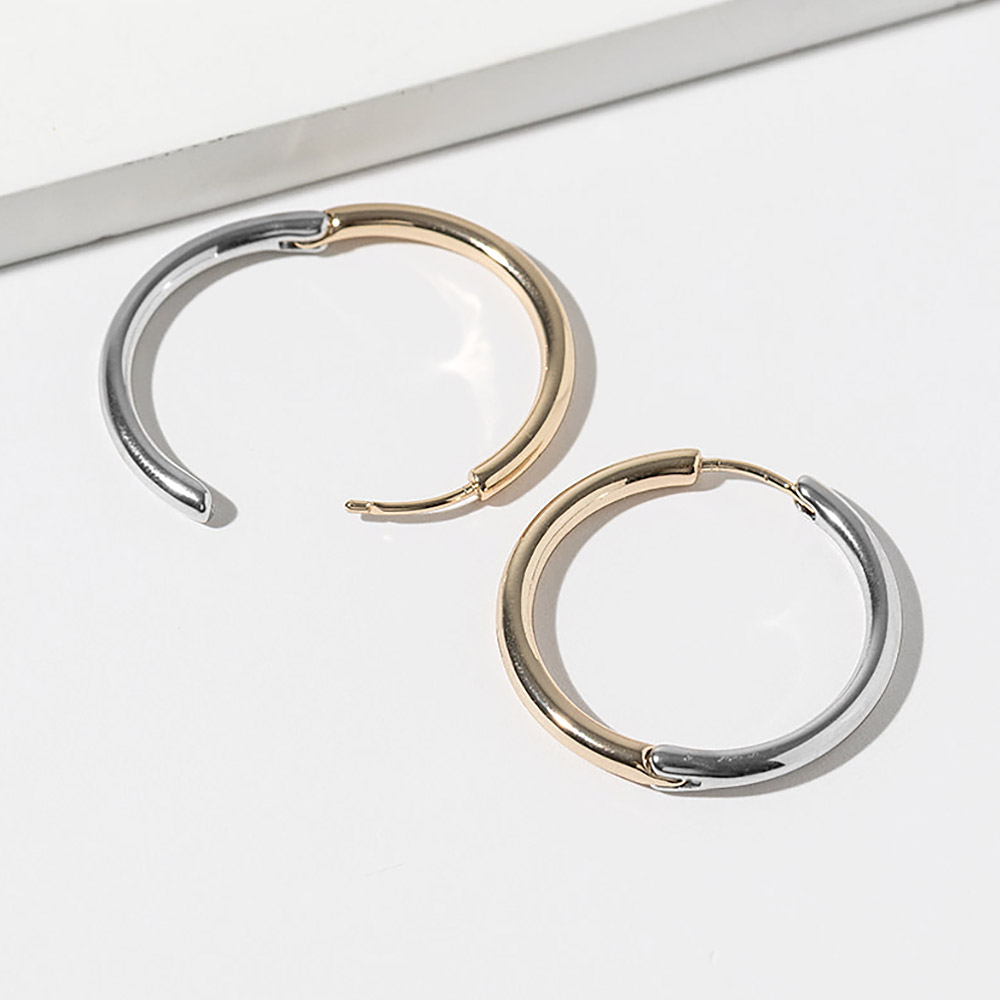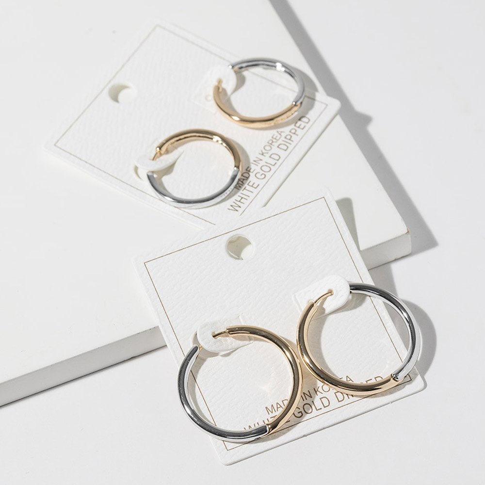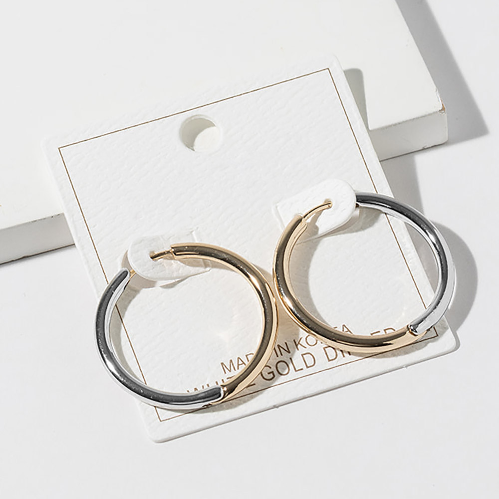 Details • Size : 1.25" X 1.25" • Huggie Back • Timeless hoop earrings featuring a smooth rounded silhouette with a modern dual-finish design and secure post closure. Designed for everyday wear and easy styling, these versatile hoops offer clean lines, balanced contrast, and effortless elegance, making them a staple accessory for casual, work, and polished looks. • Gold Dipped • Lead and Nickel Compliant • Made In Korea