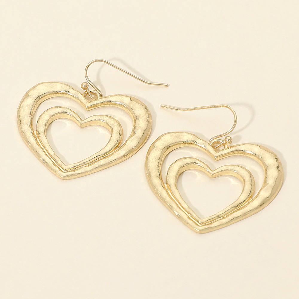 Worn Metal Hammered Double Heart Layered Drop Earrings Worn Metal Hammered Double Heart Layered Drop Earrings