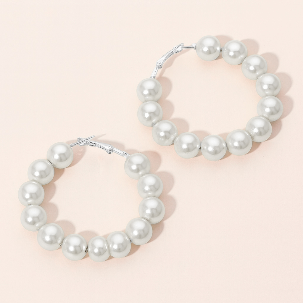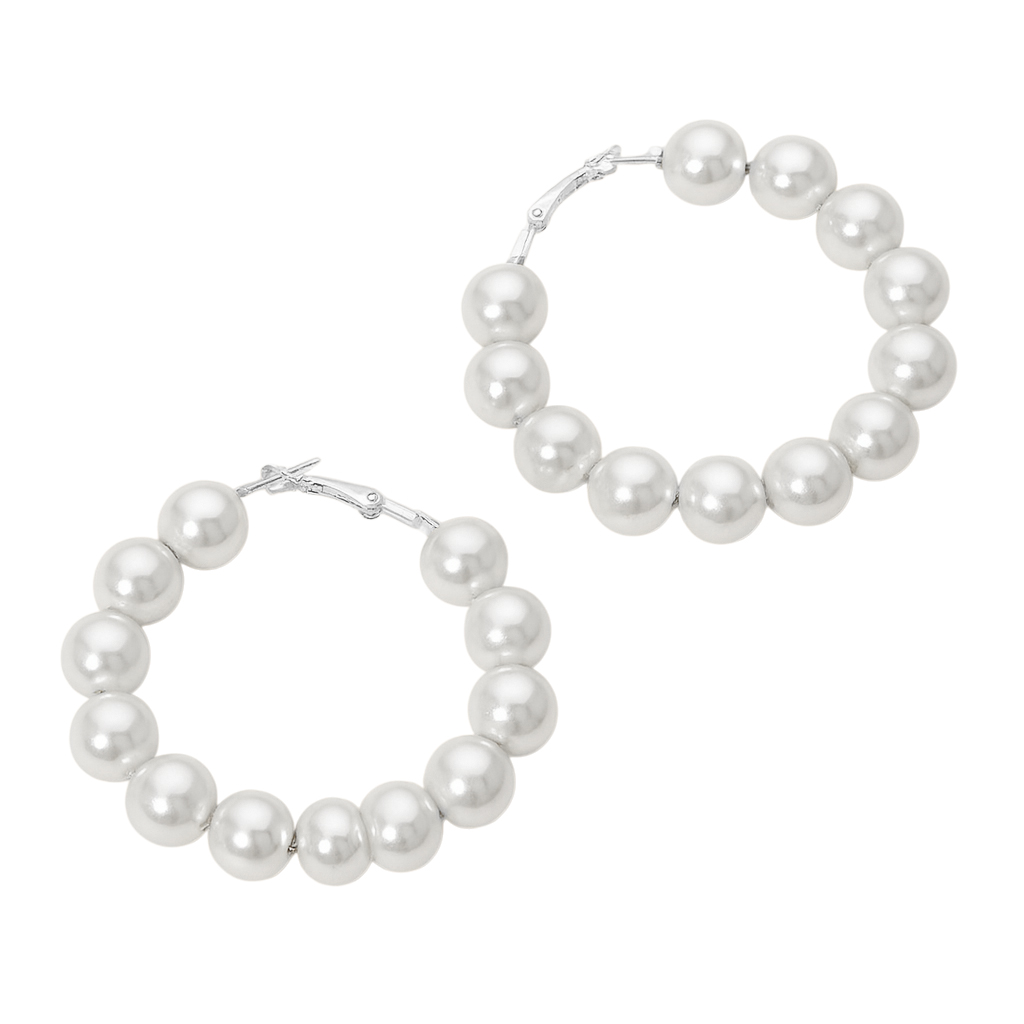 Details • Size : 2.75" X 2.75" • Omega Back • Elegant hoop earrings adorned with smooth round beads in a polished design. Lightweight and refined, these versatile earrings add timeless charm to both casual and dressy looks. • Lead and Nickel Compliant