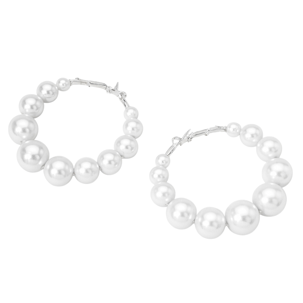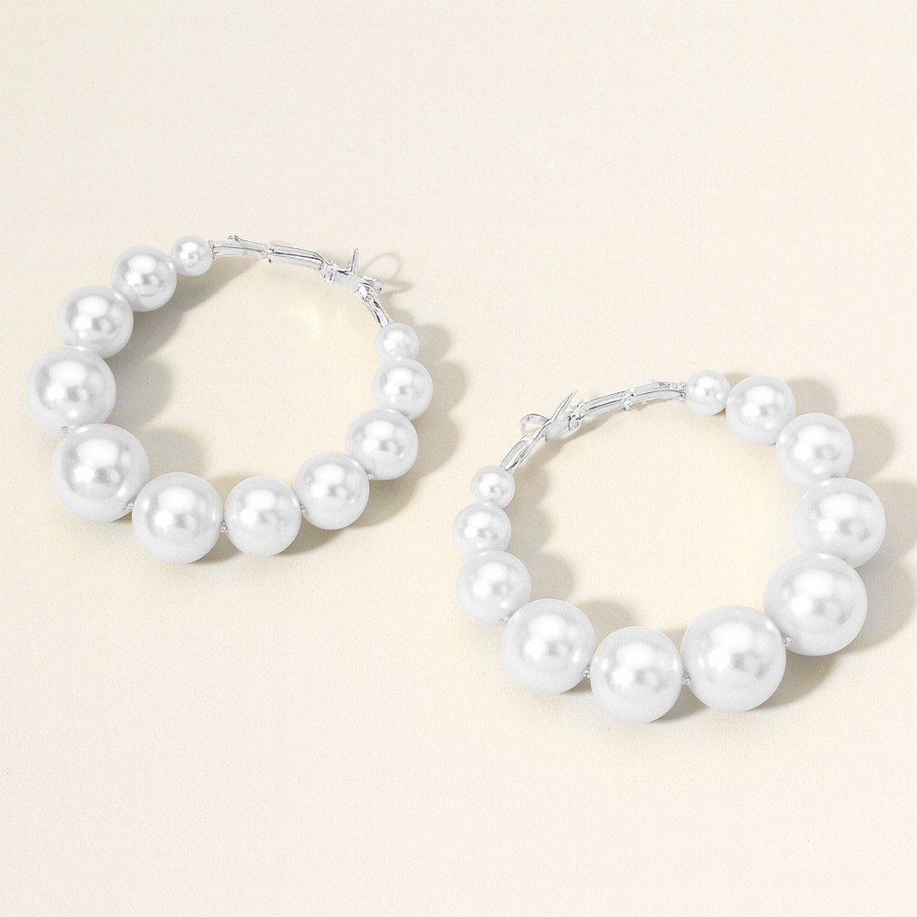 Details • Size : 2.25" X 2.25" • Omega Closure • Elevate your accessories with these bold beaded faux pearl hoop earrings featuring a playful arrangement of glossy round beads. The vibrant and dynamic design adds a fun and lively touch to your outfit, making them perfect for festivals, casual wear, or standout fashion statements. • Lead and Nickel Compliant