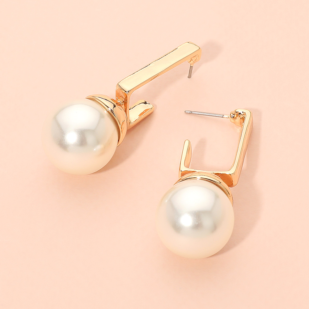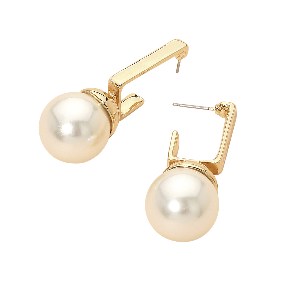 Details • Size : 0.75" X 1.8" • Post Back • These modern pearl drop earrings pair a bold spherical accent with a sleek geometric hook, creating a refined yet contemporary silhouette. Their eye-catching design adds effortless elegance to any look, making them an ideal choice for both polished daytime style and elevated evening wear. • Hypoallergenic • Lead and Nickel Compliant
