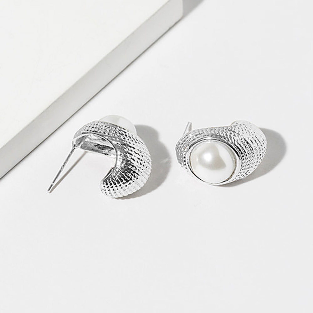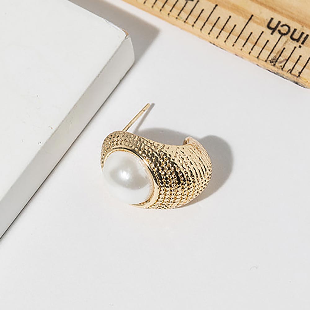 Details • Size : 0.5" X 0.75" • Textured crescent stud earrings featuring a sculpted curved shape with a smooth round pearl accent for a refined, modern look. Designed to elevate everyday styling, these studs pair effortlessly with casual outfits, office wear, or layered ear looks, offering timeless appeal with subtle statement detail. • Gold Dipped • Lead and Nickel Compliant • Made In Korea • Sterling Silver Post