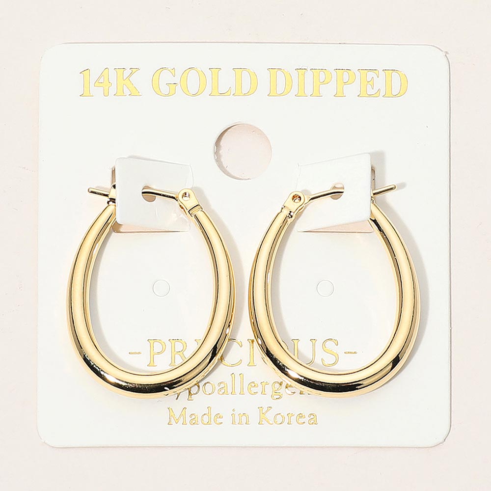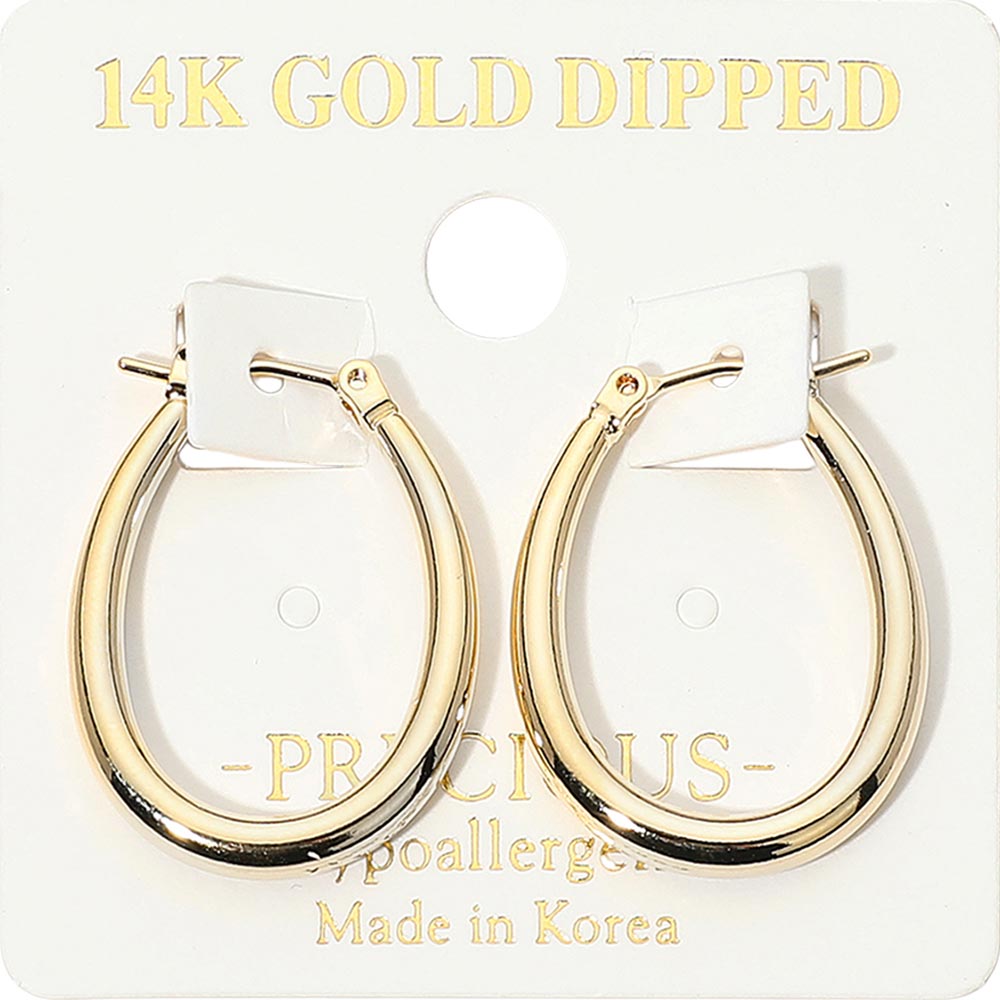 Details • Size : 0.8" X 1" • Pin Catch • Timeless oval hoop earrings designed with a smooth, polished finish for an elegant yet versatile look. Lightweight and comfortable for daily wear, these hypoallergenic hoops elevate casual, work, or dressy outfits with effortless sophistication. Ideal for gifting or enhancing any jewelry collection. • Lead and Nickel Compliant • Hypoallergenic • Made In Korea • Gold Dipped