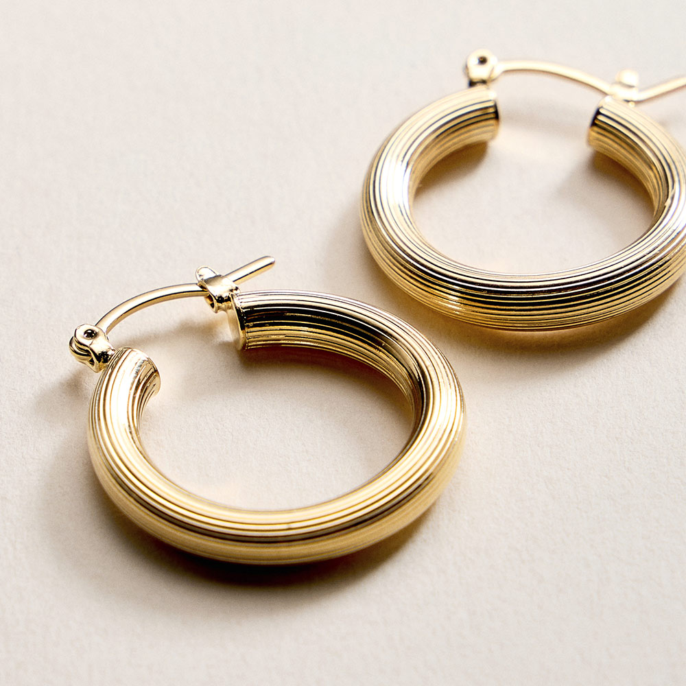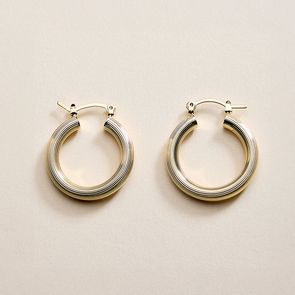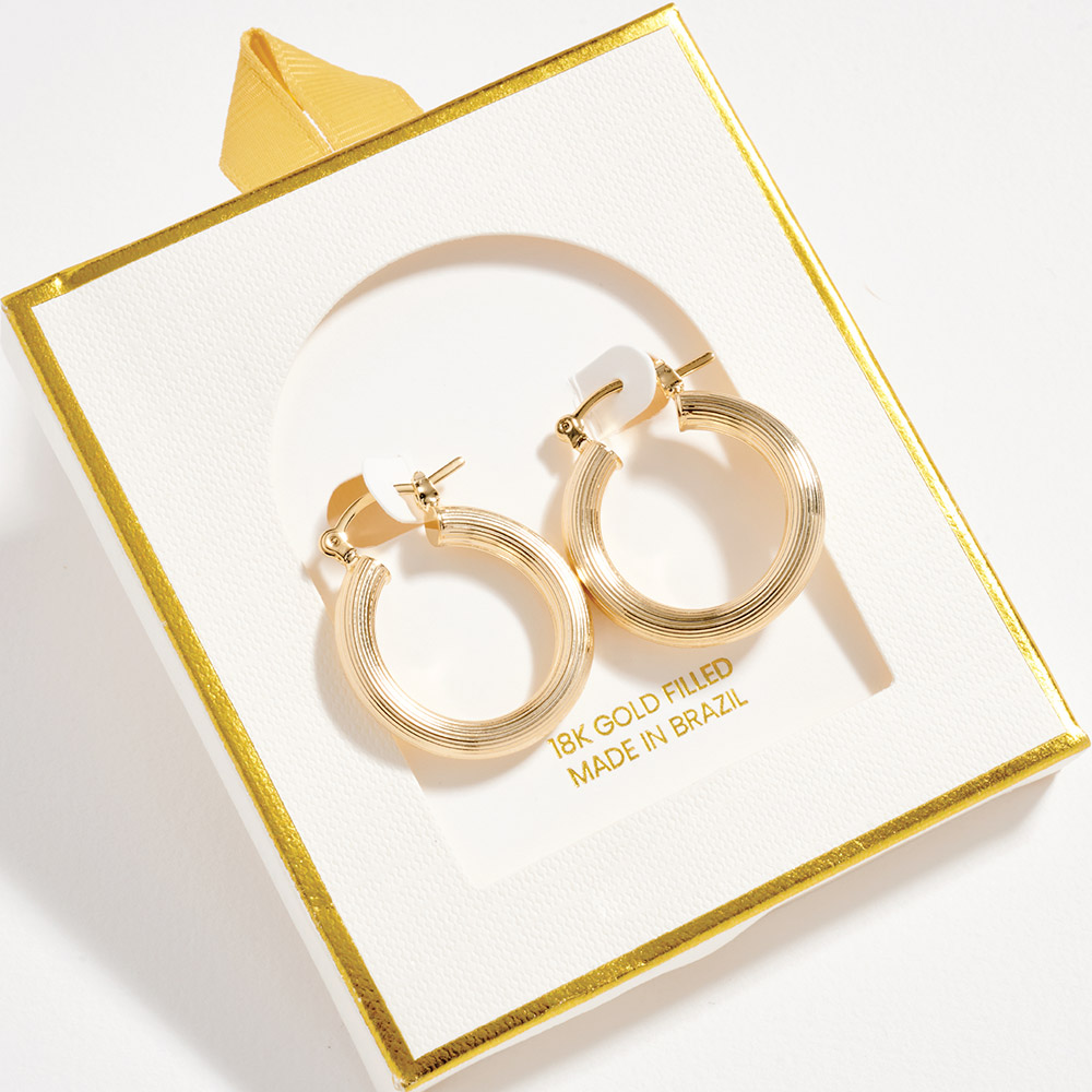 Details • Size : 1" X 1" • Pin Catch • Classic hoop earrings designed with a smooth, rounded profile that delivers timeless appeal and everyday versatility. The clean silhouette offers effortless styling for casual looks or polished outfits. A staple accessory ideal for layering, gifting, or adding a refined finish to any jewelry collection. • Gold Filled • Hypoallergenic • Lead and Nickel Compliant • Made In Brazil