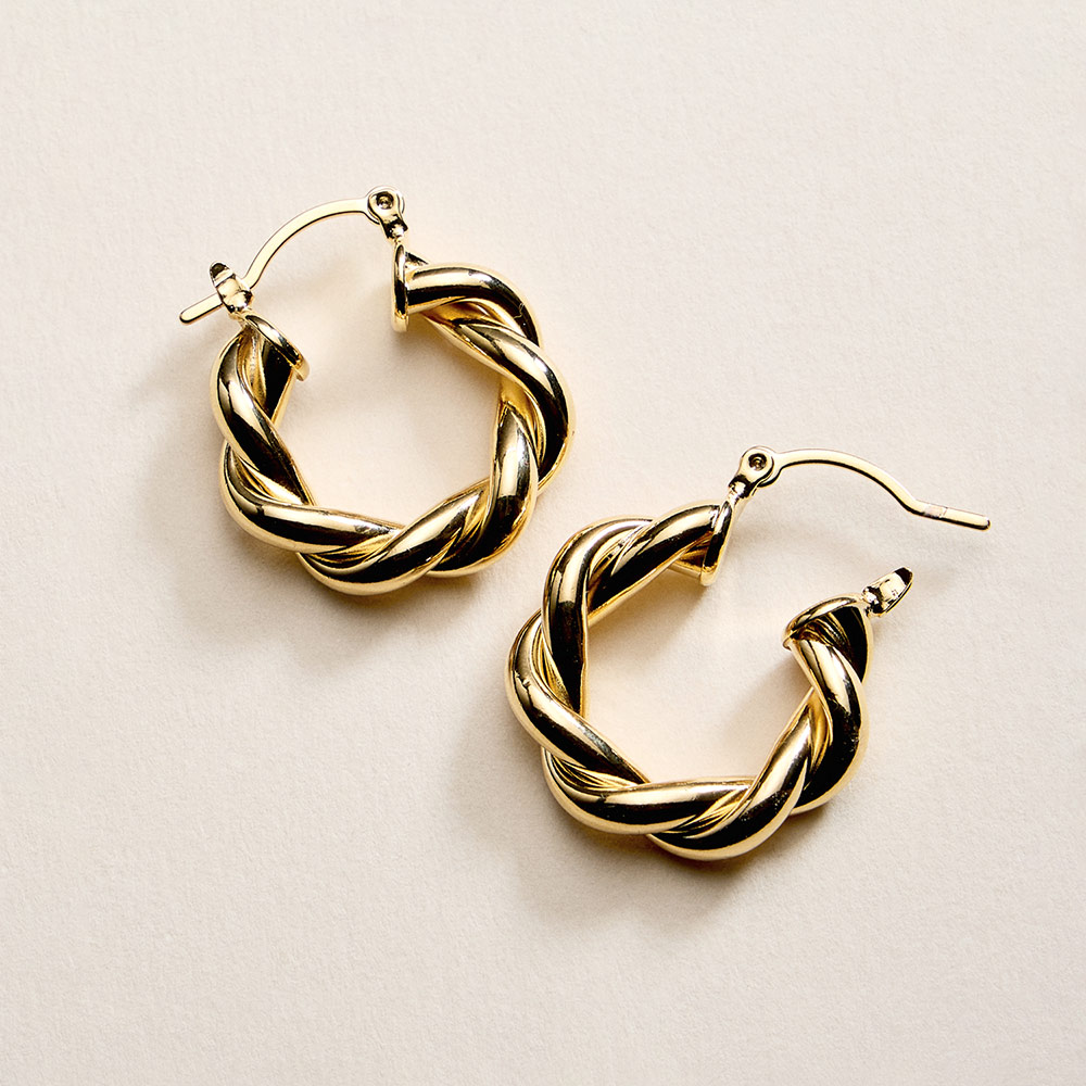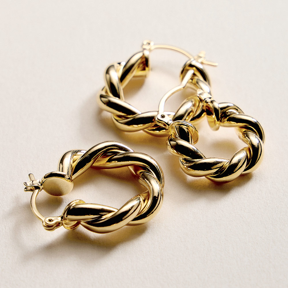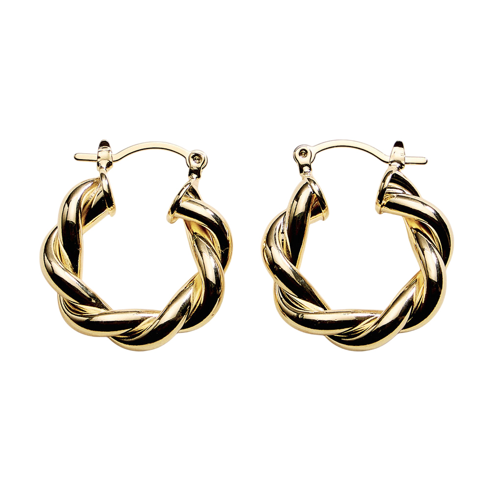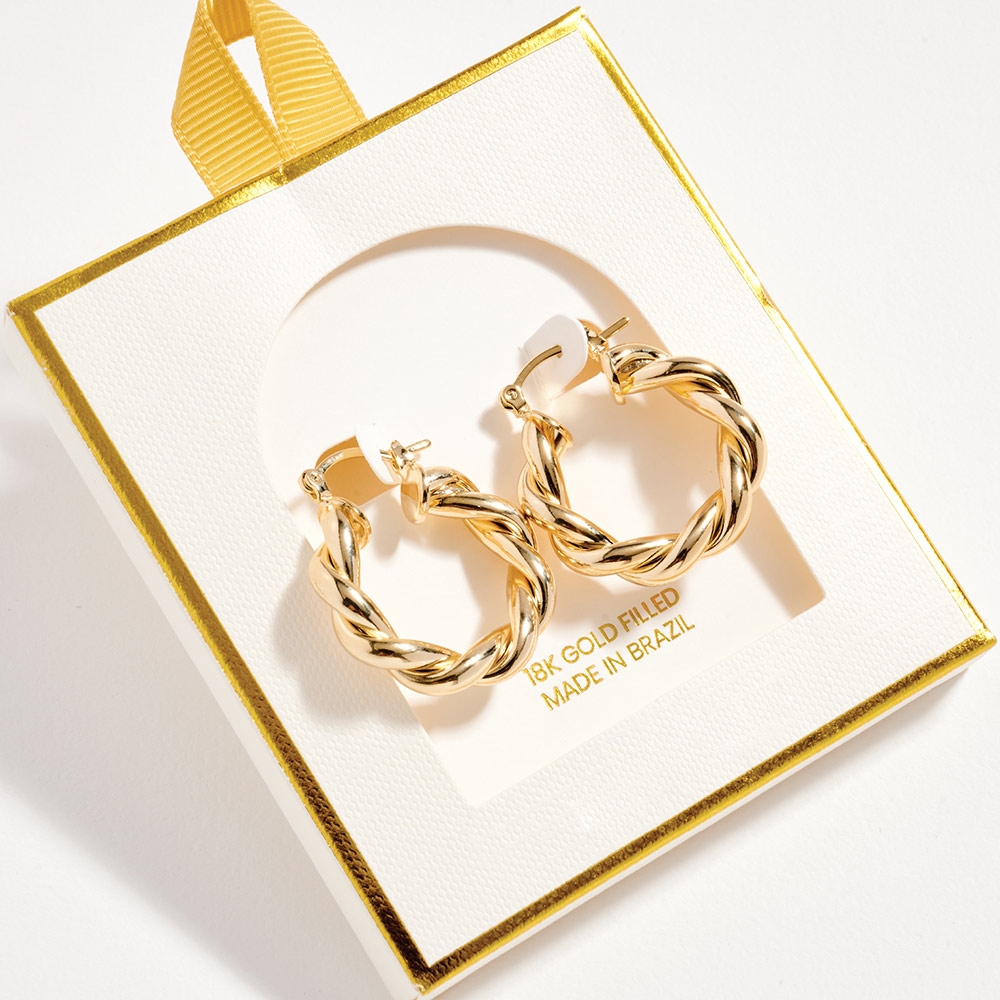 Details • Size : 1" X 1" X 0.2" • Pin Catch • Twisted hoop earrings featuring an intertwined rope-inspired design that adds texture and dimension to a classic silhouette. The rounded shape delivers a bold yet balanced look, perfect for everyday wear or elevated styling. A versatile statement piece ideal for layering, gifting, or completing modern and timeless outfits. • Gold Filled • Hypoallergenic • Lead and Nickel Compliant • Made In Brazil