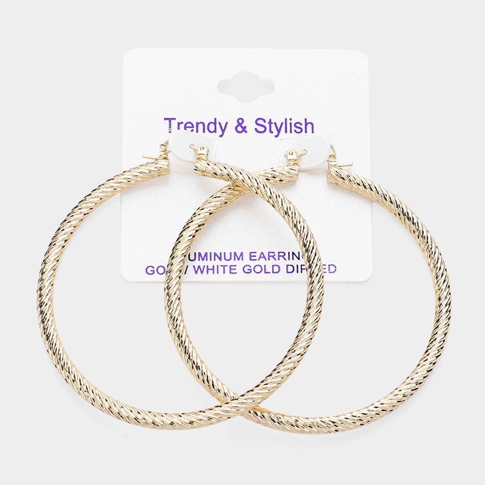 • Modern twisted hoop earrings designed with a textured surface for added dimension and shine. A versatile essential that elevates everyday looks while complementing dressy outfits. Ideal for boutiques seeking timeless hoop styles with a fashionable edge and easy styling appeal.