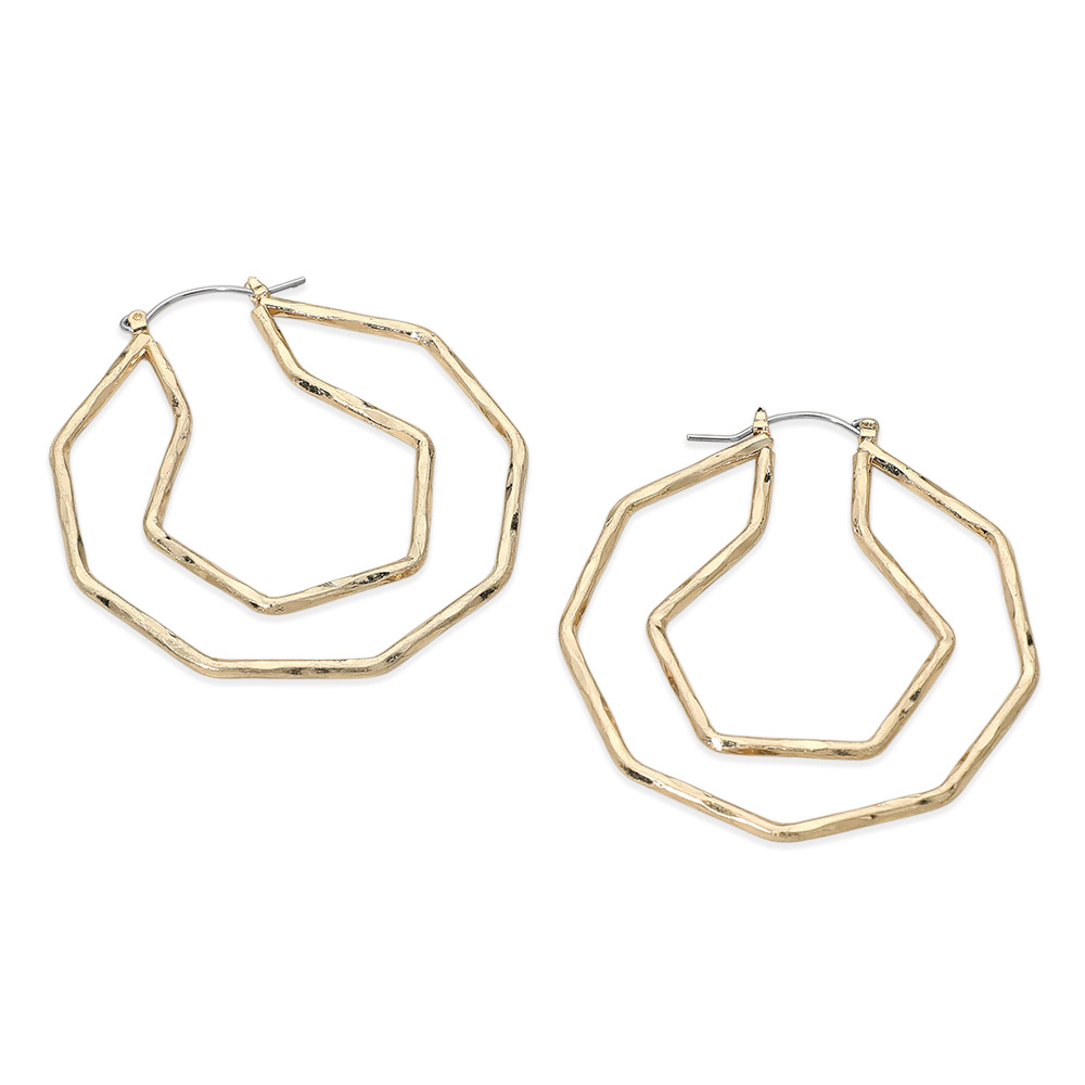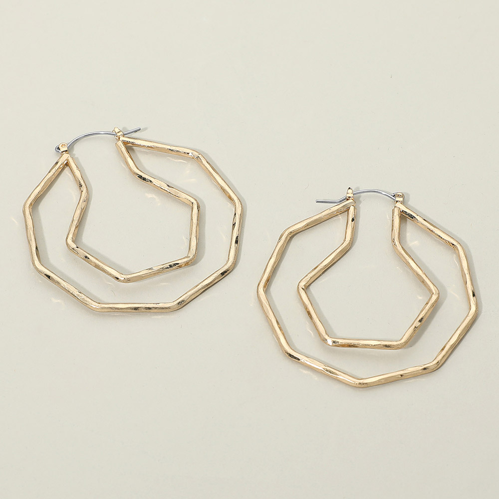 Details • Size : 2" X 2" • Pin Catch • Bold abstract double hoop earrings featuring an irregular geometric silhouette for a modern statement look. Designed with layered open shapes that create movement and visual interest, this lightweight style elevates everyday outfits while adding an artistic edge perfect for casual, work, or evening wear. • Lead and Nickel Compliant