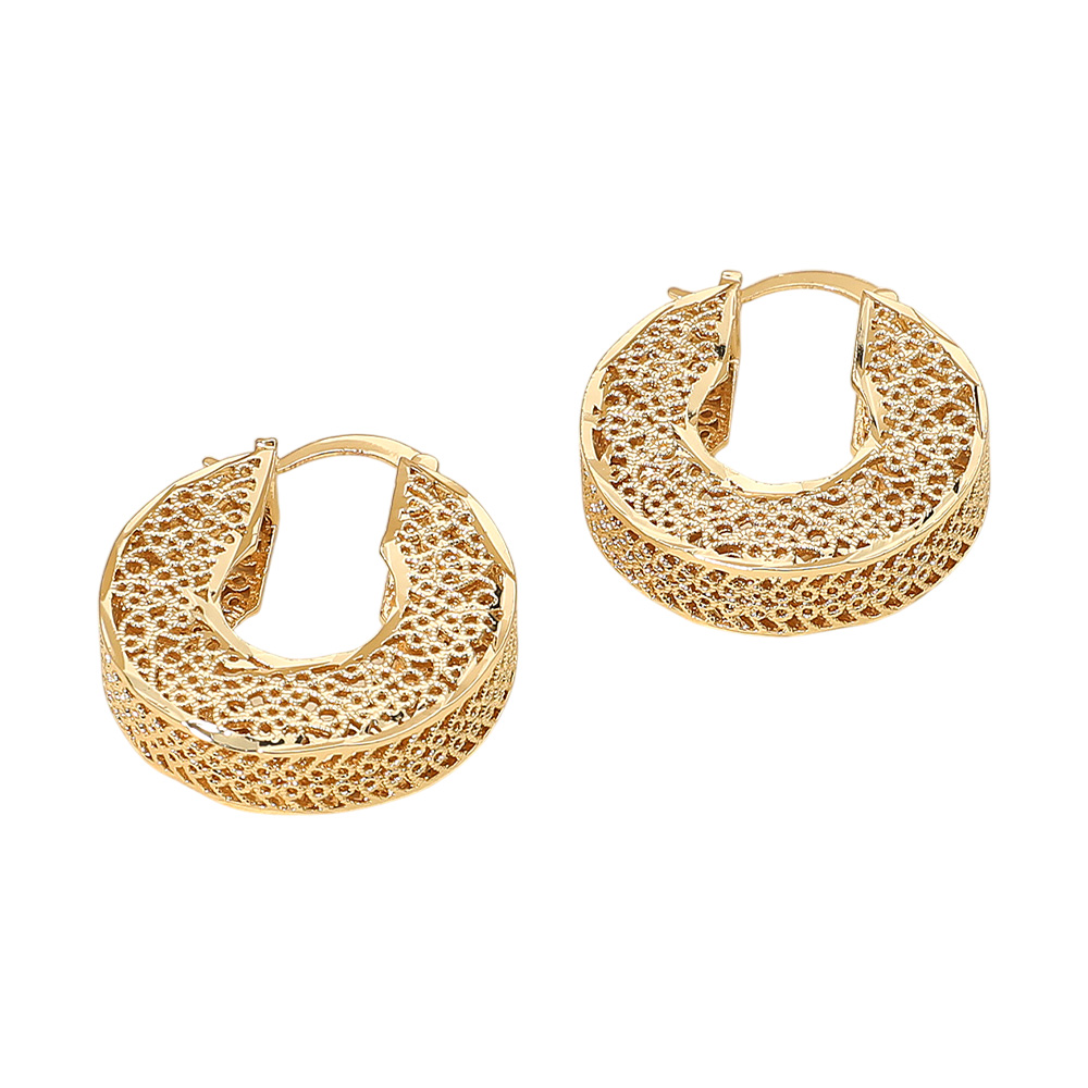 Details • Size : 1.2" X 1.2" • Pin Catch • Make a bold statement with these textured wide hoop earrings, designed with an intricate openwork pattern for a touch of elegance. Their classic shape and shimmering finish make them versatile for both day and evening wear, adding sophistication and style to any jewelry collection. • Lead and Nickel Compliant