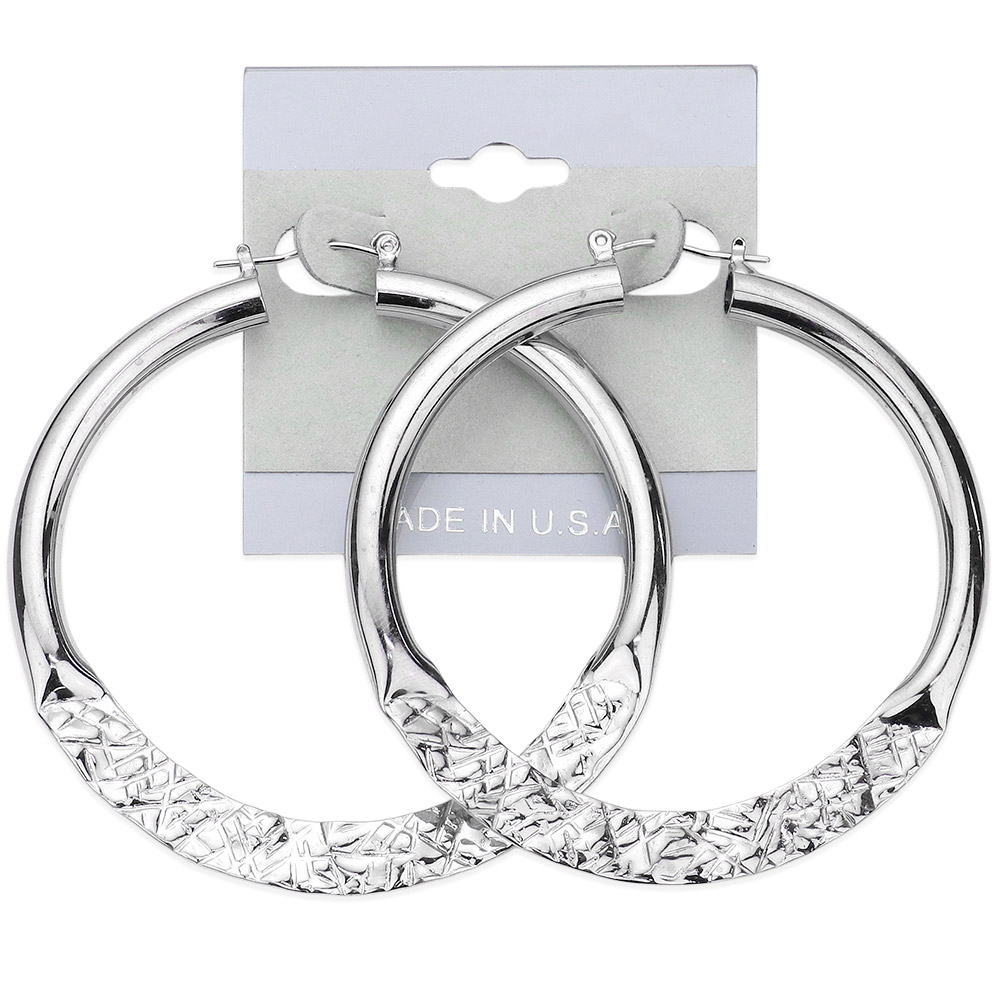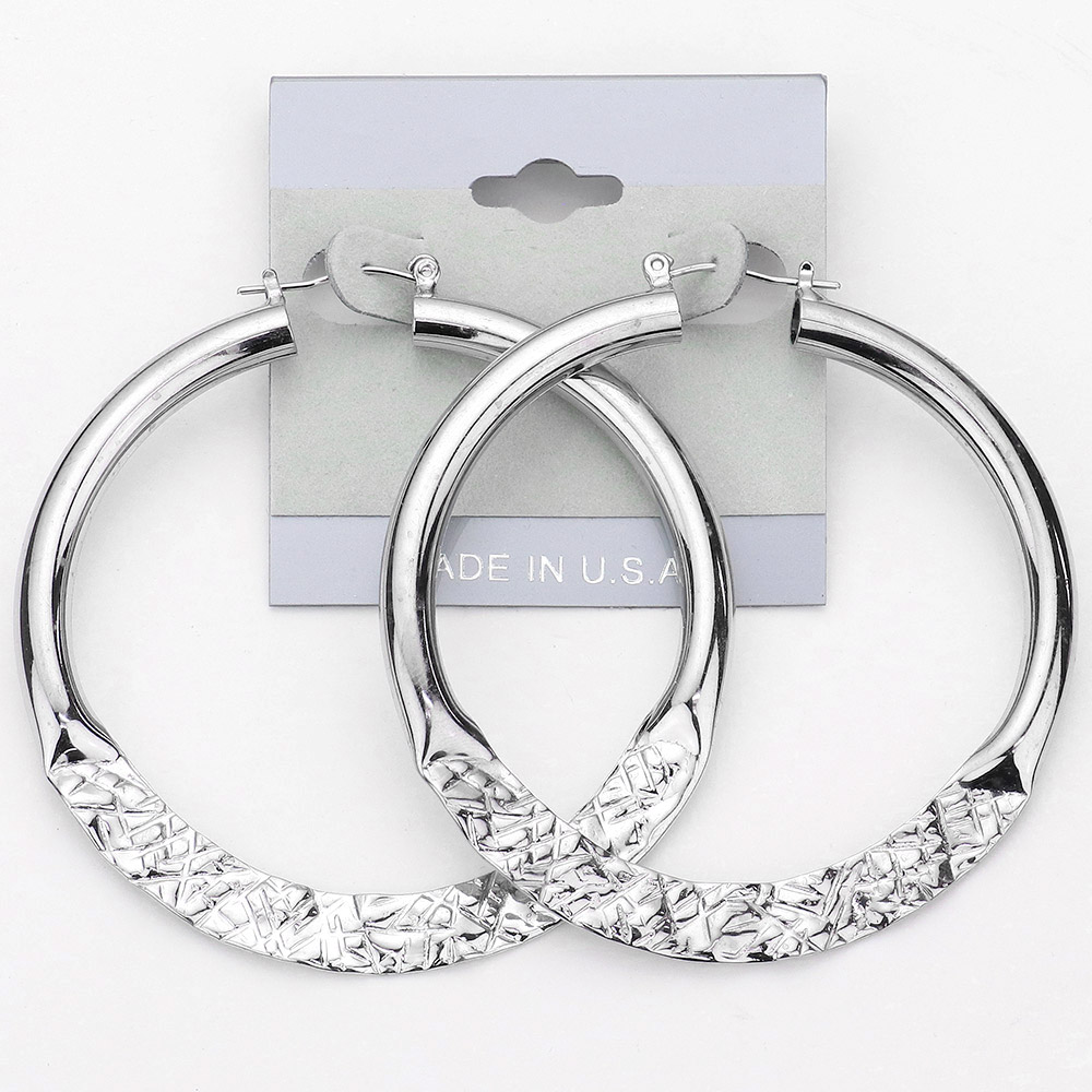 Details • Size : 2.5" L • Pin Catch • Made In USA • Add bold texture to your look with round hoop earrings featuring a unique hammered and woven-inspired surface. Their eye-catching design combines classic hoop style with modern detailing, making them a standout accessory for casual wear, evening outfits, or special events.