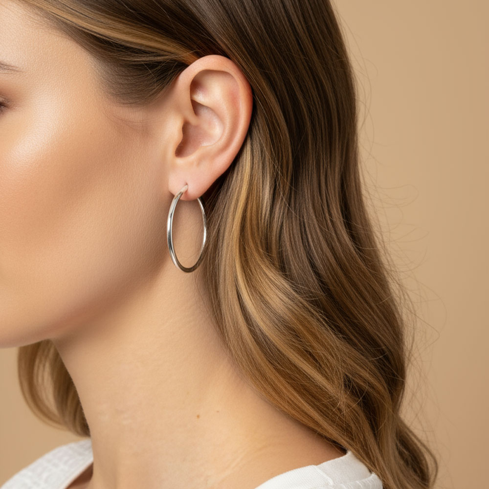 Details • Size : 1.6" X 1.6" • Pin Catch • Water resistant plating • Chic medium-small hoop earrings with a sleek, lightweight design. Perfect for everyday wear, these hoops strike the balance between subtle and stylish, offering versatile elegance that easily complements casual or professional looks. • Brass • Gold Dipped • Hypoallergenic • Lead and Nickel Compliant • Made In Korea