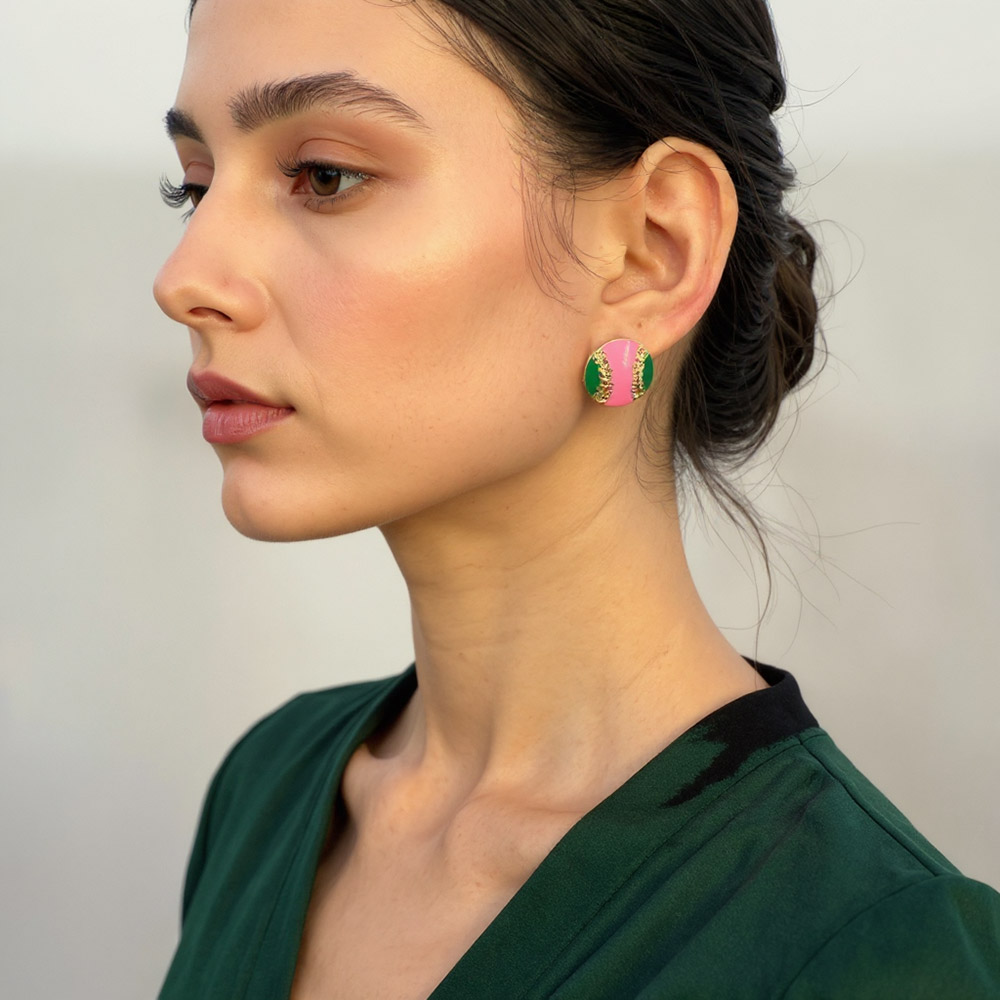 Details • Size : 0.7" X 0.7" • Post Back • Fun and sporty, these baseball shape enamel stud earrings feature a bold two-tone design accented with raised stitch-like detailing. Their unique style blends playful charm with everyday wearability, making them a standout piece for casual or statement looks. • Brass • Gold Dipped • Hypoallergenic • Lead and Nickel Compliant • Made In Korea