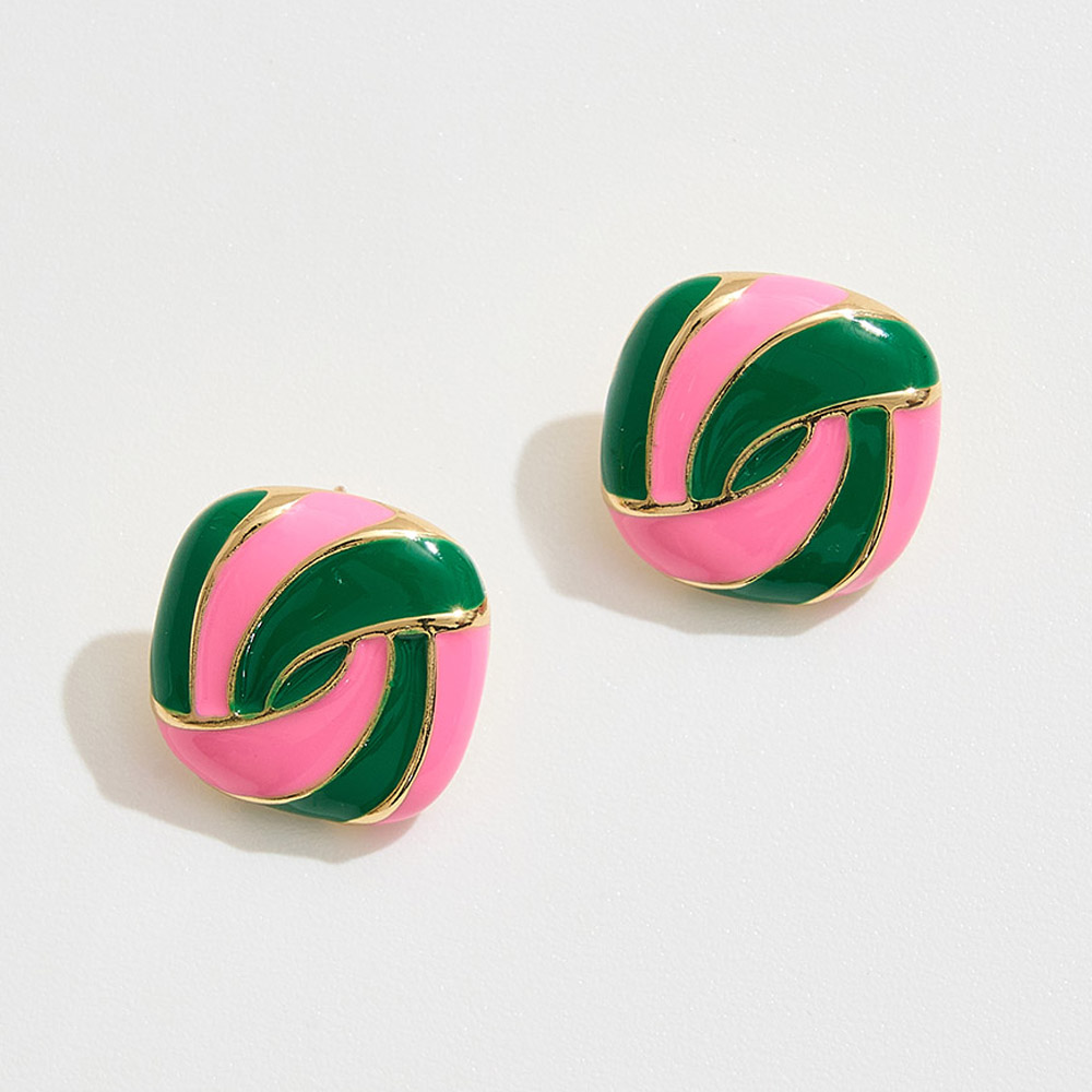 Details • Size : 0.7" X 0.7" • Post Back • Bold yet versatile, these enamel swirl stud earrings feature a vibrant two-tone design with a sculpted, interwoven pattern. Their modern shape and statement style make them the perfect accessory to elevate both casual and sophisticated looks. • Brass • Gold Dipped • Hypoallergenic • Lead and Nickel Compliant • Made In Korea