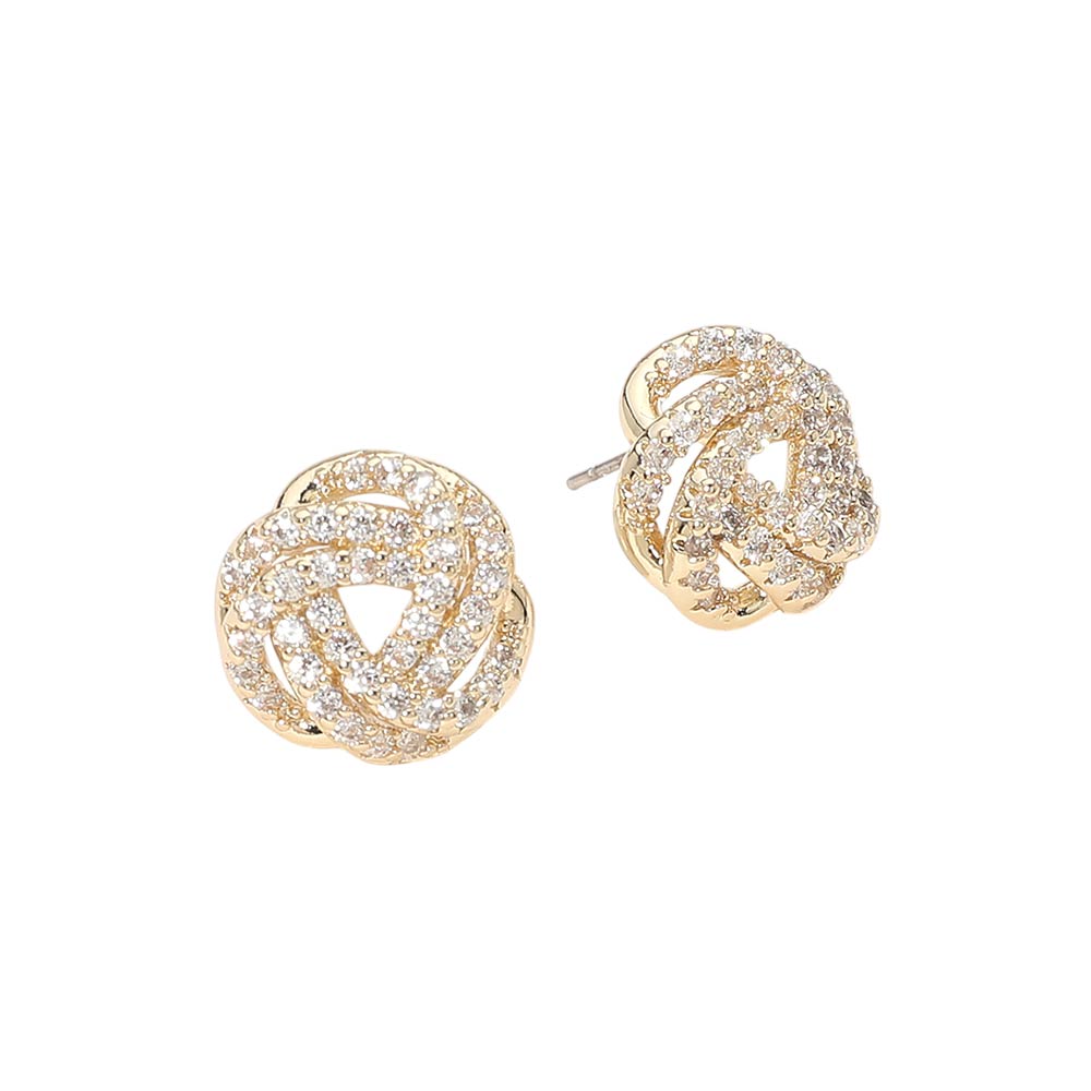 • These stud earrings feature an elegant intertwined knot design accented with shimmering stones for a refined, dimensional look. The compact silhouette offers timeless appeal while adding subtle sparkle. Perfect for everyday wear or special occasions, these earrings bring polished style and graceful detail to any jewelry assortment.