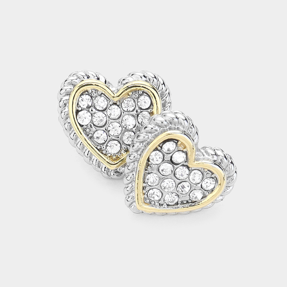 14K Gold Plated Stone Paved Two Tone Heart Stud Earrings