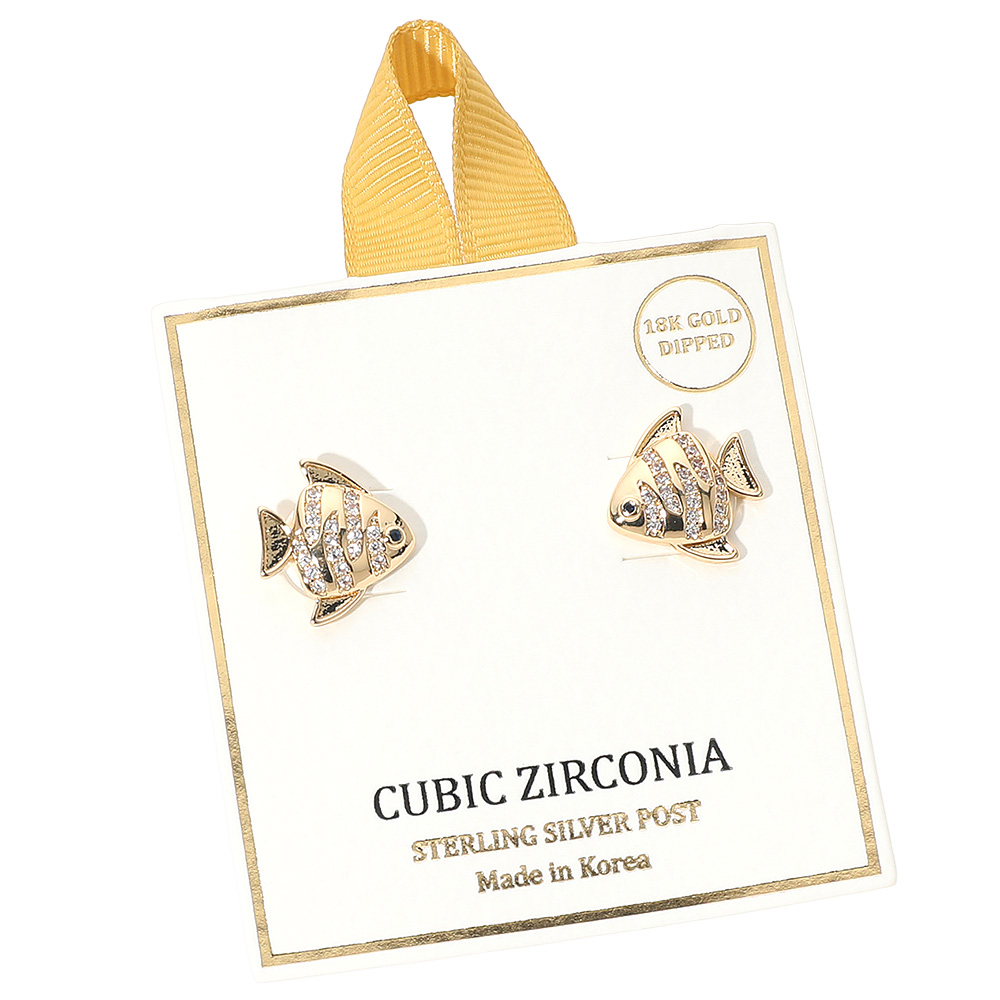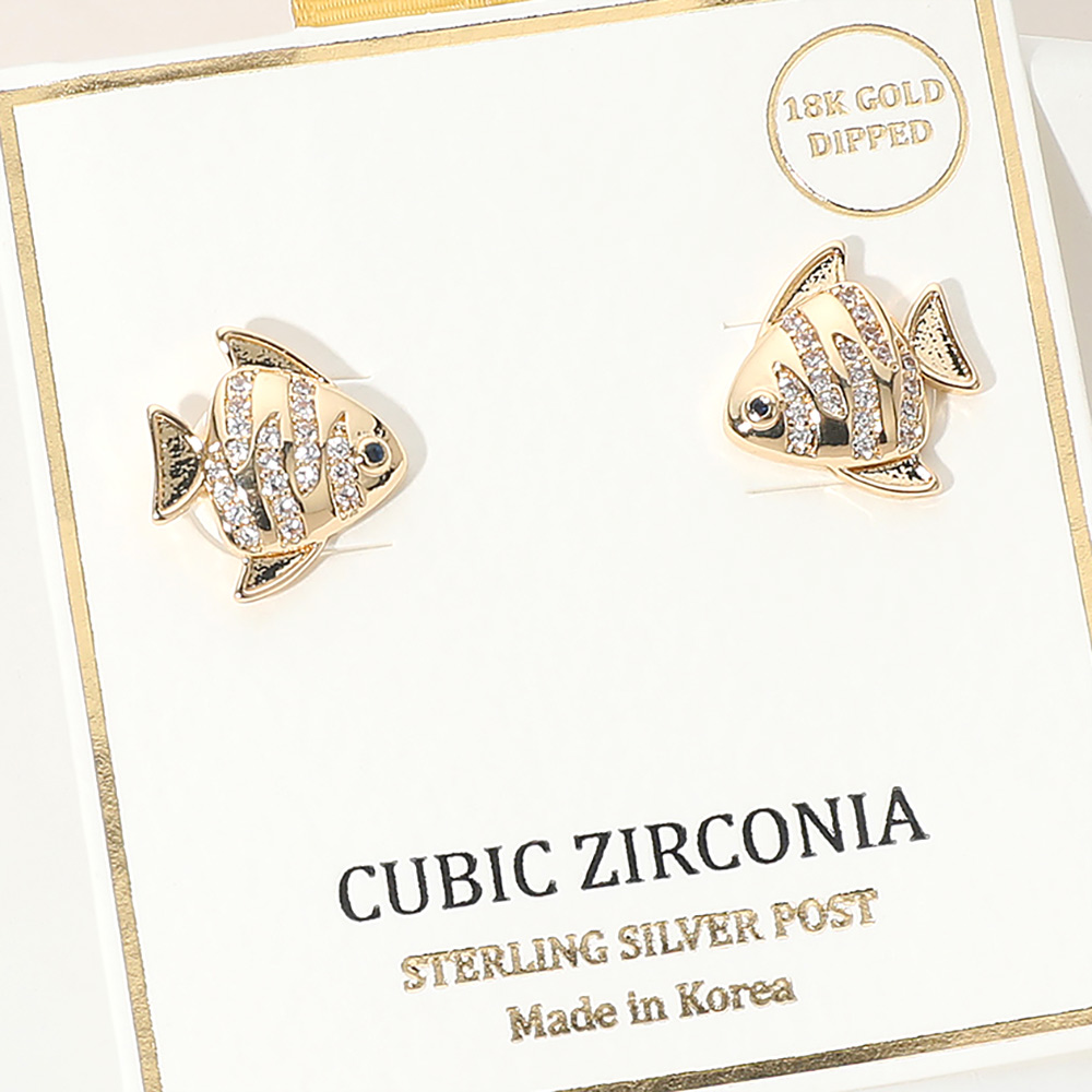 Details • Size : 0.6" X 0.6" • Charming cubic zirconia fish stud earrings with a petite marine-inspired design. Features a sparkling fish-shaped silhouette on a sterling silver post, ideal for everyday wear or gifting. A cute ocean-themed accessory. • Lead and Nickel Compliant • Made In Korea • Gold Dipped • CZ Cubic Zirconia • Sterling Silver Post