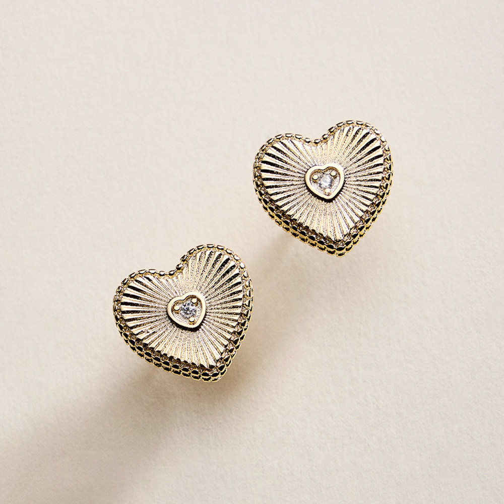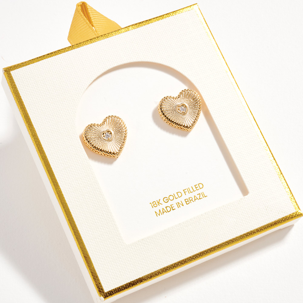 Details • Size : 0.7" X 0.6" • Post Back • Elegant heart stud earrings featuring a detailed textured design with a sparkling CZ center accent. The classic stud silhouette offers comfortable everyday wear while adding a romantic touch. Ideal for gifting, special occasions, or elevating casual and dressy looks. • CZ Cubic Zirconia • Gold Filled • Hypoallergenic • Lead and Nickel Compliant • Made In Brazil