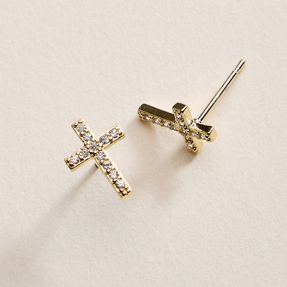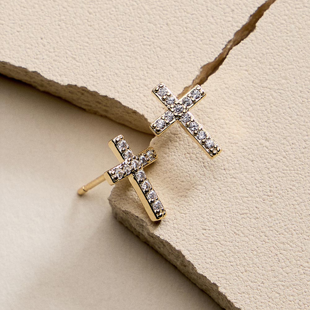• Minimal cross stud earrings featuring a pavĂ© CZ design for subtle sparkle and timeless style. Perfect for everyday wear, faith-inspired looks, or meaningful gifting, these studs offer a refined silhouette that pairs easily with casual outfits or layered ear styling.