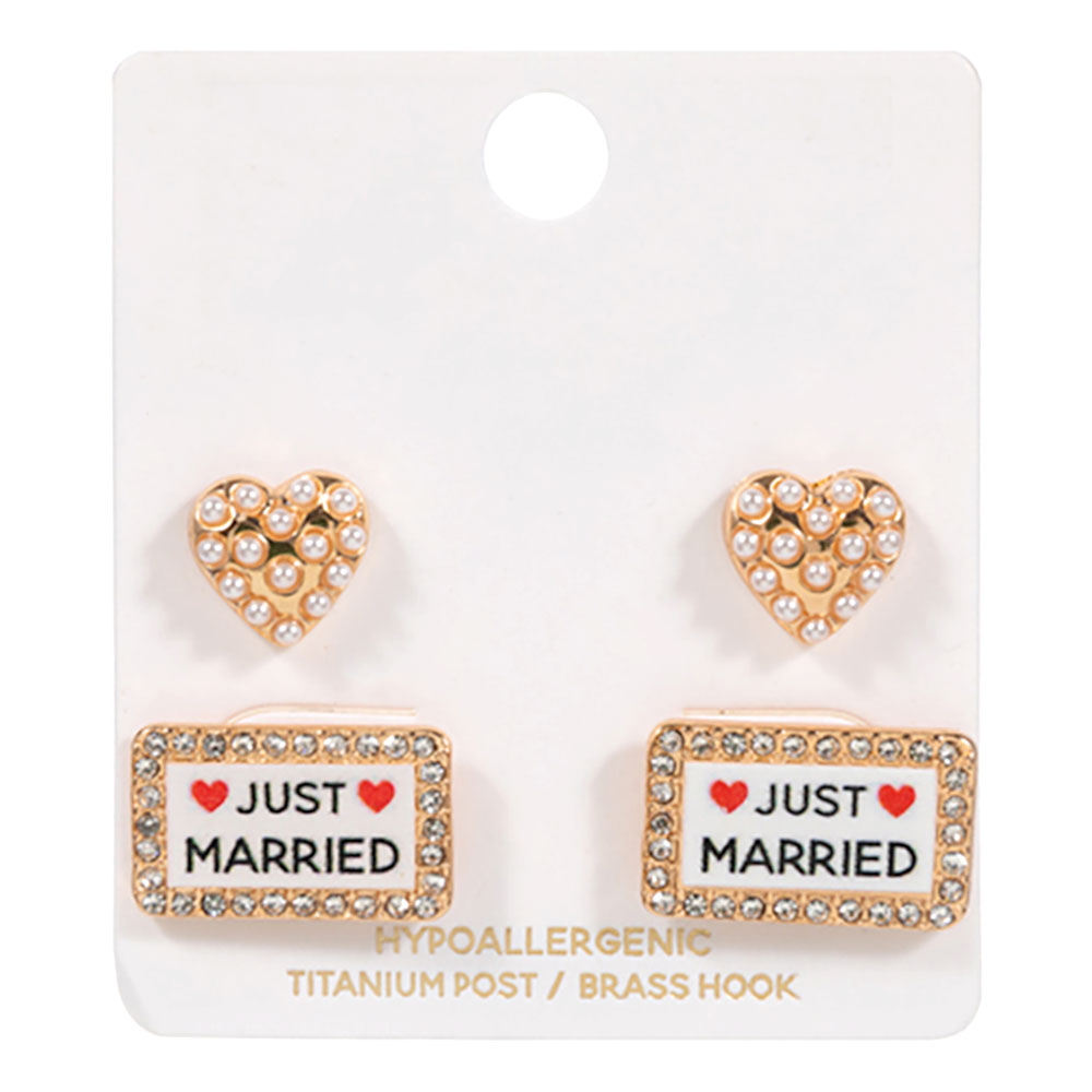 2Pairs - Pearl Heart JUST MARRIED Sign Plate Stud Earring Set 2Pairs - Pearl Heart JUST MARRIED Sign Plate Stud Earring Set 2Pairs - Pearl Heart JUST MARRIED Sign Plate Stud Earring Set
