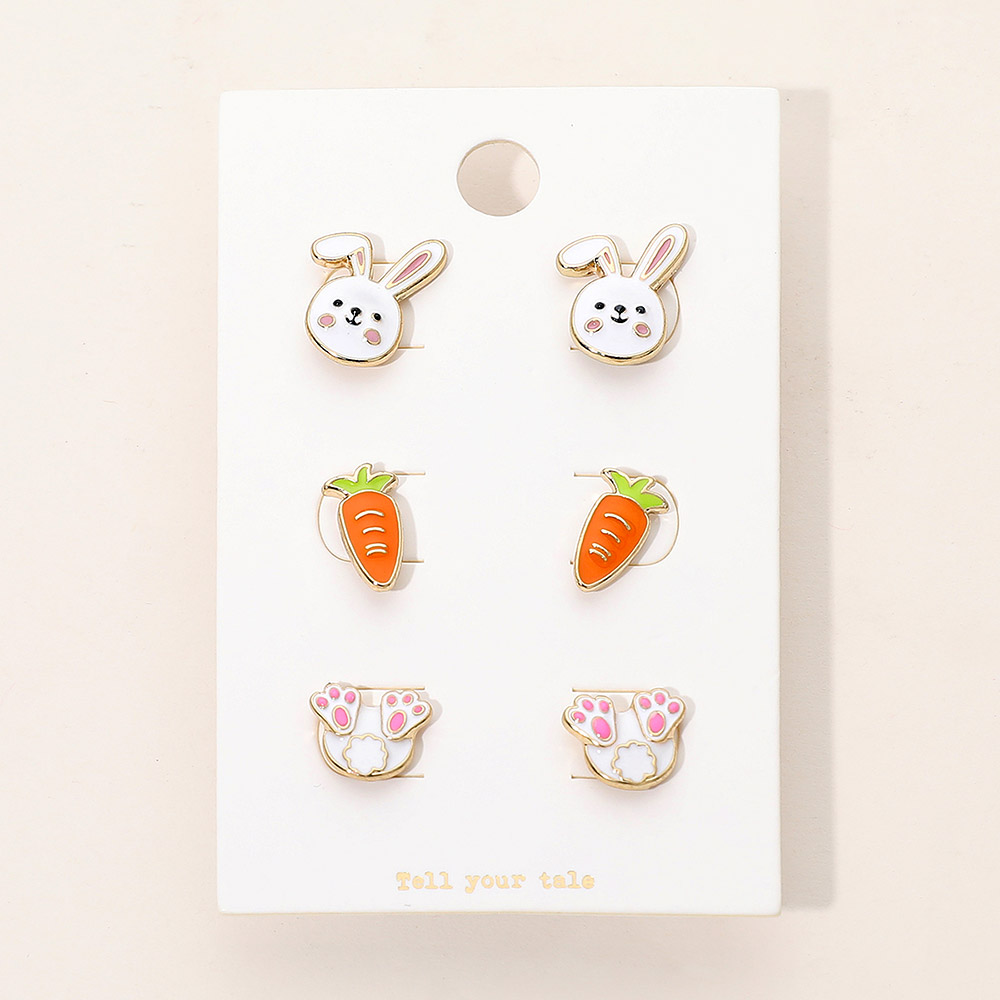 Details • Size : 0.4" - 0.6" L • Post Back • Add playful charm to your look with this three-pair stud earring set featuring smiling bunny faces, cute carrot designs, and paw-print motifs. Perfect for mixing and matching playful themes for casual outfits, seasonal wear, or thoughtful gifting. • Lead and Nickel Compliant