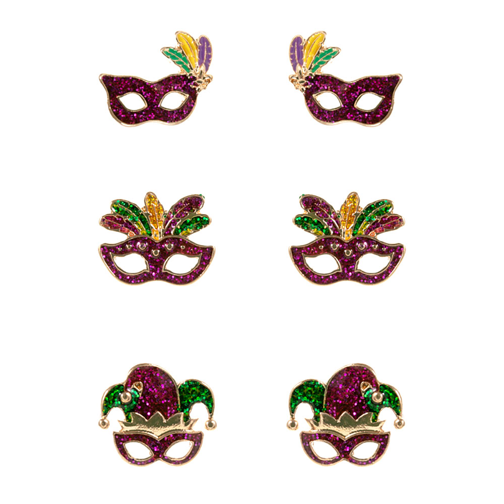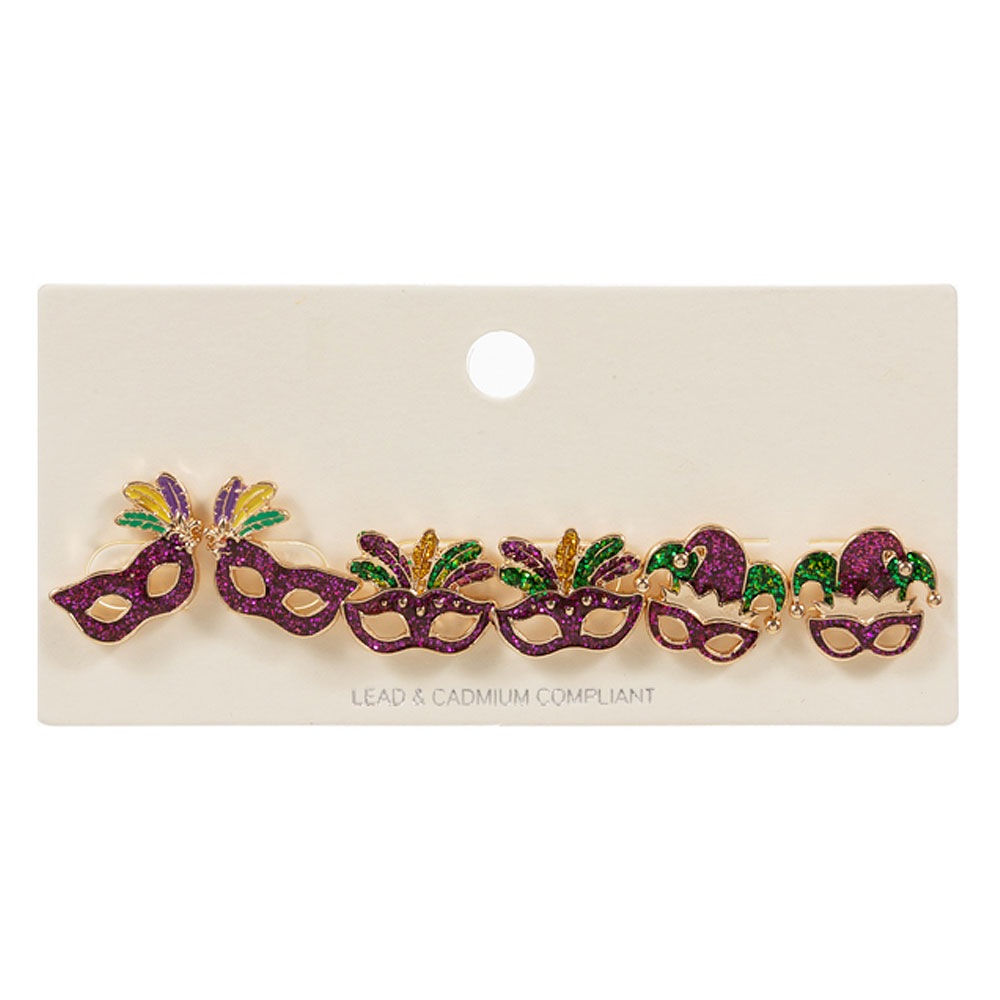 Details • Size : 0.5" L • Titanium Post Back • Bring festive flair to your look with this Mardi Gras Mask Earring Set. Featuring three glittery mask designs inspired by carnival celebration, these sparkling studs are perfect for parties, parades, or themed events, adding a touch of joyful elegance to any outfit. • Hypoallergenic • Lead and Nickel Compliant