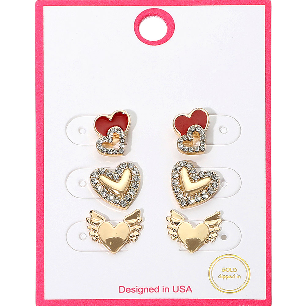 Details • Size : 0.4" - 0.5" L • Post Back • Set of three stud earrings featuring heart motifs with sparkling accents and winged designs. A playful and charming accessory trio perfect for mixing, matching, or gifting for any occasion. • Gold Dipped • Lead and Nickel Compliant