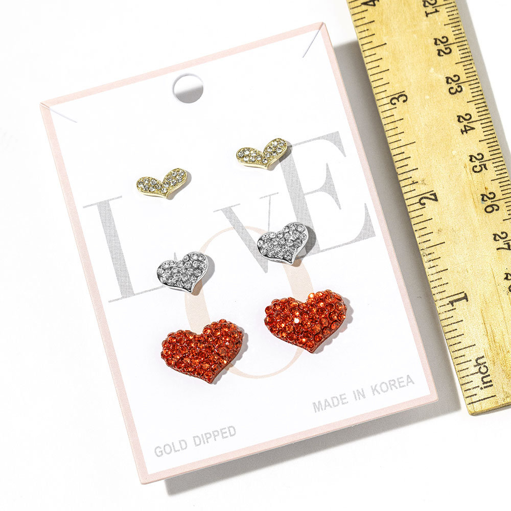 Details • Size : 0.25" - 0.6" L • Post Back • Versatile heart stud earring trio set featuring three graduated heart designs for effortless mixing and matching. Perfect for everyday wear, gifting, and layered ear styling, this charming set adds a romantic, playful touch to casual looks, seasonal collections, and boutique jewelry assortments while offering multiple styling options in one set. • Gold Dipped • Lead and Nickel Compliant • Made In Korea