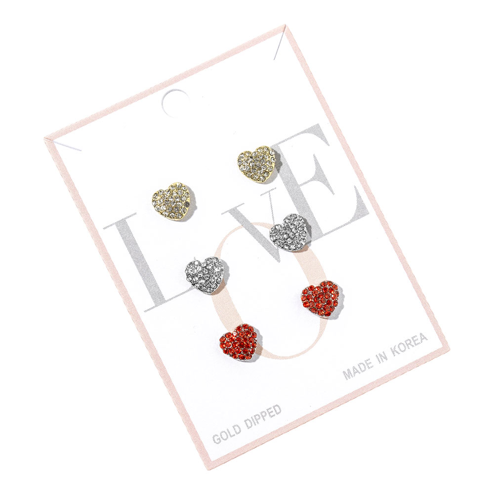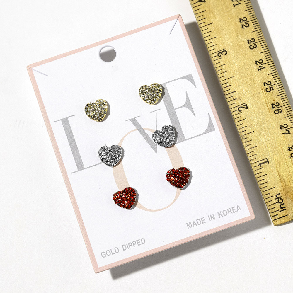 Details • Size : 0.4" L • Post Back • Heart stud earring trio set designed for versatile everyday styling. Features three coordinated heart shapes ideal for mixing and matching across multiple piercings. A charming, giftable jewelry option perfect for boutiques, seasonal collections, and customers seeking playful yet timeless ear accessories for casual or dressed-up looks. • Gold Dipped • Lead and Nickel Compliant • Made In Korea