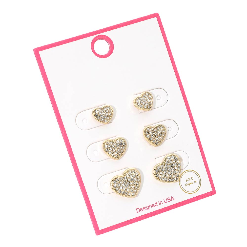 3Pairs - Gold Dipped Stone Pave Heart Stud Earring Set 3Pairs - Gold Dipped Stone Pave Heart Stud Earring Set