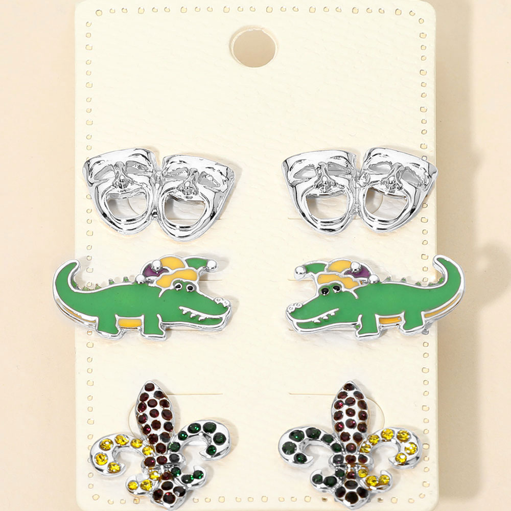 3Pairs - Mardi Gras Mask Crocodile Fleur de Lis Stud Earring Set 3Pairs - Mardi Gras Mask Crocodile Fleur de Lis Stud Earring Set