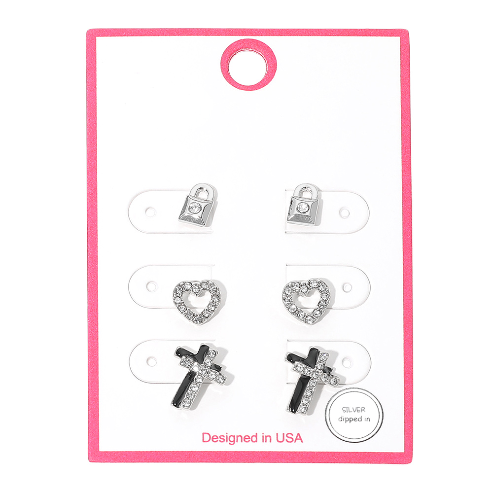 Details • Size : 0.3" - 0.5" L • Post Back • Stud earring set featuring lock, heart, and cross designs for versatile everyday wear. A coordinated multi pair set ideal for gifting, faith inspired styling, and boutique displays. Perfect for mixing and matching, stacking looks, or wearing individually for meaningful and trend focused accessory styling. • Lead and Nickel Compliant • Sterling Silver Dipped