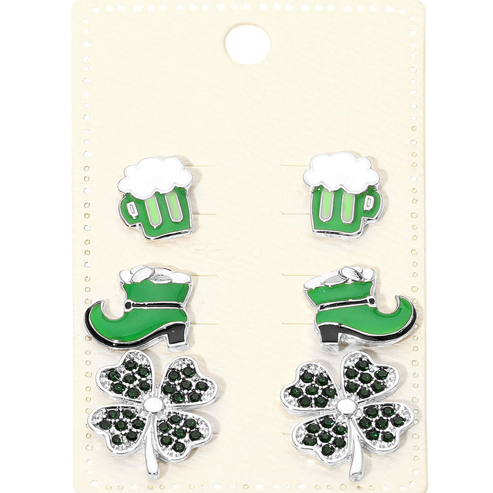 3Pairs - St Patricks Clover Boot Beer Mug Stud Earring Set