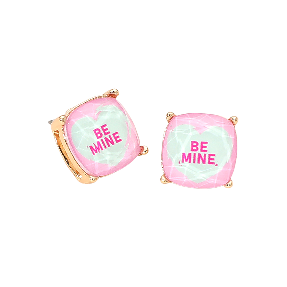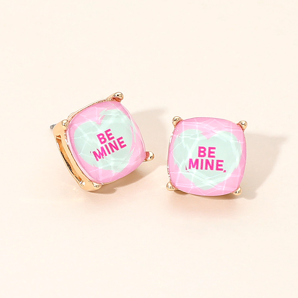 Details • Size : 0.5" X 0.5" • Post Back • Fun stud earrings featuring a bold “BE MINE” message with a faceted design for a playful statement look. Lightweight and easy to wear, perfect for adding personality to everyday outfits, casual looks, or gifting with an uplifting and cheerful touch. • Lead and Nickel Compliant