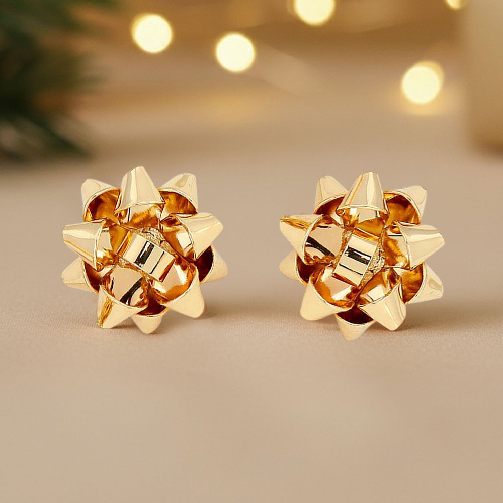 Details • Size : 0.6" X 0.6" • Post Back • Add festive charm to your look with these gift bow stud earrings. Featuring a playful, dimensional bow design, they’re perfect for holiday parties, birthdays, or everyday flair. Lightweight and eye-catching, they make a fun statement with any outfit or occasion. • Lead and Nickel Compliant