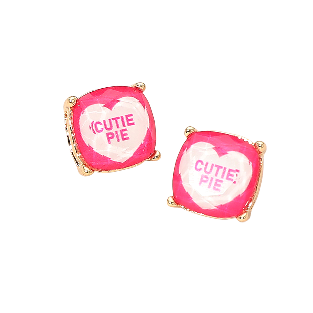 Details • Size : 0.5" X 0.5" • Post Back • Fun stud earrings featuring a bold “CUTIE PIE” message with a faceted design for a playful statement look. Lightweight and easy to wear, perfect for adding personality to everyday outfits, casual looks, or gifting with an uplifting and cheerful touch. • Lead and Nickel Compliant