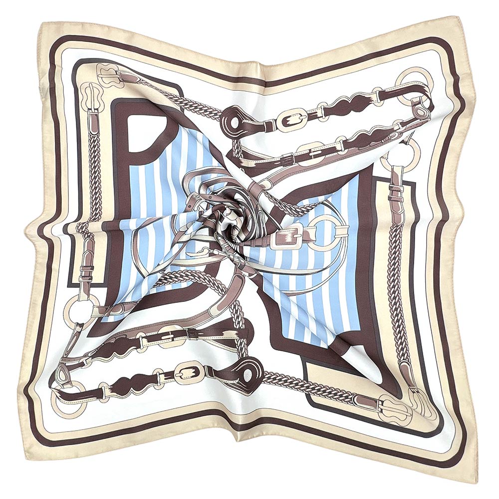 Details • Size : 27.6" X 27.6" • Material : 100% Polyester • This square fashion scarf features a refined equestrian rope and buckle motif arranged in a layered, symmetrical design with classic detailing. Ideal for elevating everyday outfits, it can be styled around the neck, worn as a hair accessory, tied to a handbag, or layered for a polished finish. A versatile accessory choice for boutiques seeking timeless, pattern-driven scarves with strong visual impact and year-round styling appeal.