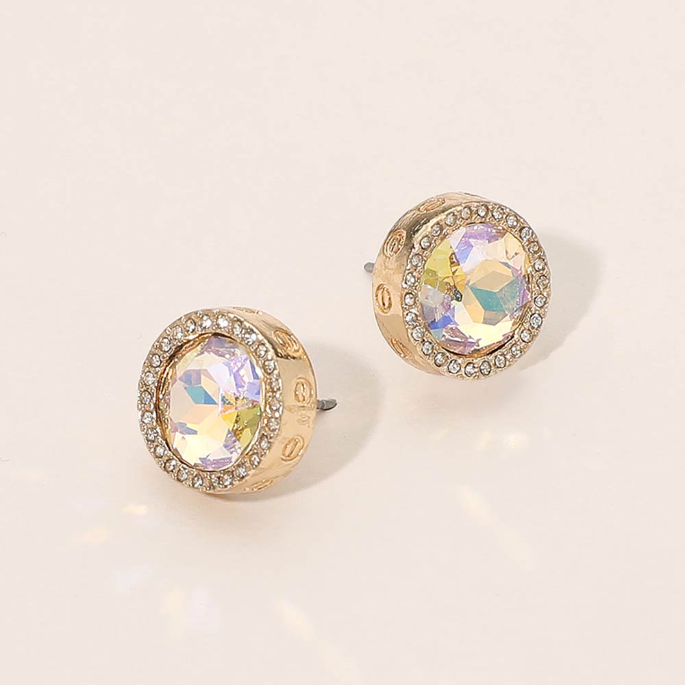 Details • Size : 0.6" X 0.5" • Post Back • Refined stud earrings featuring a faceted center design framed by a detailed halo for added dimension and shine. The classic round silhouette offers a balanced look that transitions easily from daytime wear to evening styling, making these studs ideal for boutiques, gifting collections, and everyday fashion displays. • Lead and Nickel Compliant