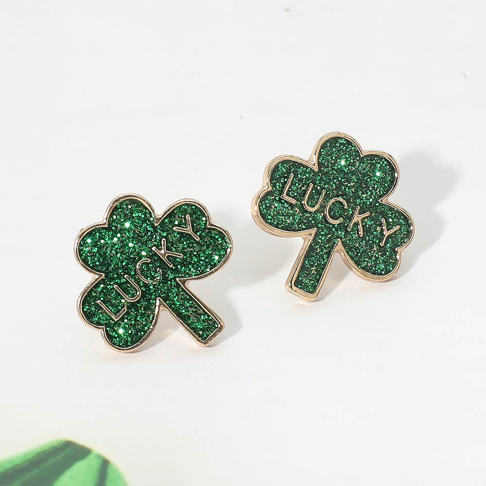 Details • Size : 0.75" X 0.75" • Post Back • These lucky shamrock stud earrings feature a sparkling clover design with engraved lettering that adds playful charm. Lightweight and easy to wear, they are perfect for St. Patrick’s Day celebrations, festive events, themed outfits, and seasonal displays. A great choice for gift shops, party favors, and holiday jewelry collections, offering eye-catching appeal customers love. • Lead and Nickel Compliant